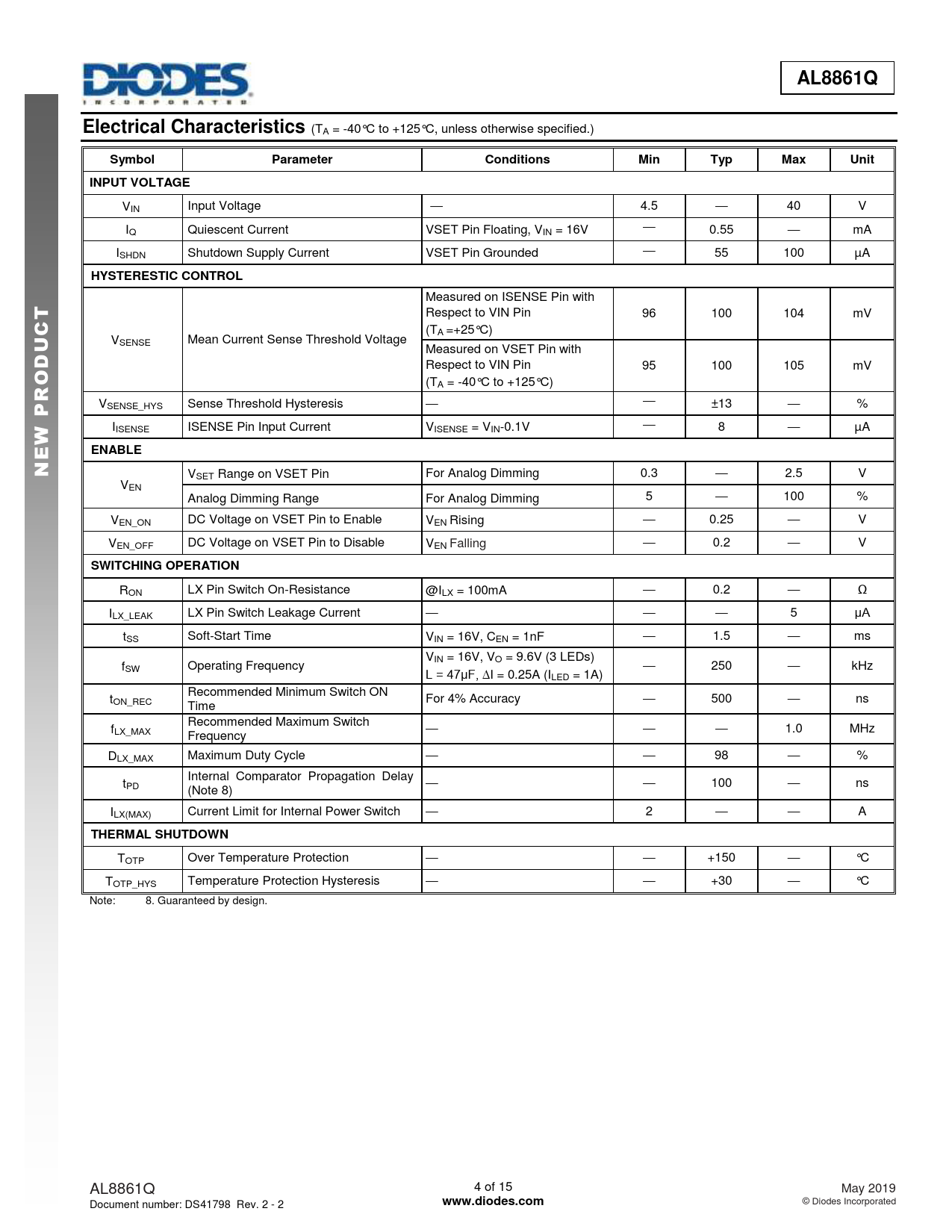 AL8861Q. Electrical Characteristics. Symbol. Parameter. Conditions. Min. Typ. Max. Unit. INPUT VOLTAGE. HYSTERESTIC CONTROL. ENABLE