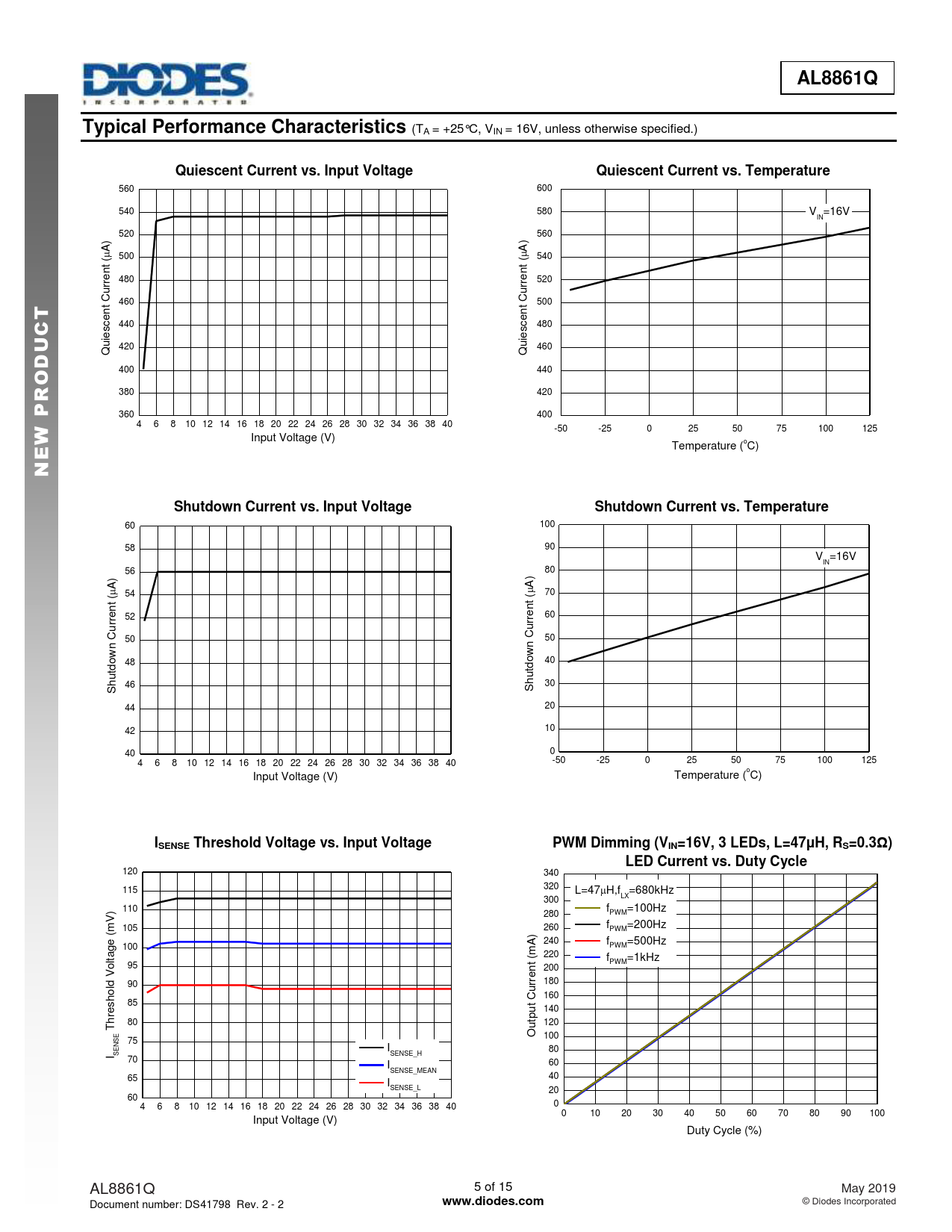 120 340 320 115 L=47H,f =680kHz 300 LX 110 f =100Hz 280 PWM 105 260 f =200Hz PWM (mV) e 240 f =500Hz PWM 100 g at (mA) 220 l t f =1kHz PWM 95 Vo n 200 dl 90 rre 180 o u 160 C sh 85 t re u 140 p h t 80 120 T u E O 100 75 NS E I 80 I S SENSE_H 70 60 ISENSE_MEAN 40 65 ISENSE_L 20 60 0 4 6 8 10 12 14 16 18 20 22 24 26 28 30 32 34 36 38 40 0 10 20 30 40 50 60 70 80 90 100 Input Voltage (V) Duty Cycle (%) AL8861Q 5 of 15 May 2019 Document number: DS41798 Rev. 2 - 2