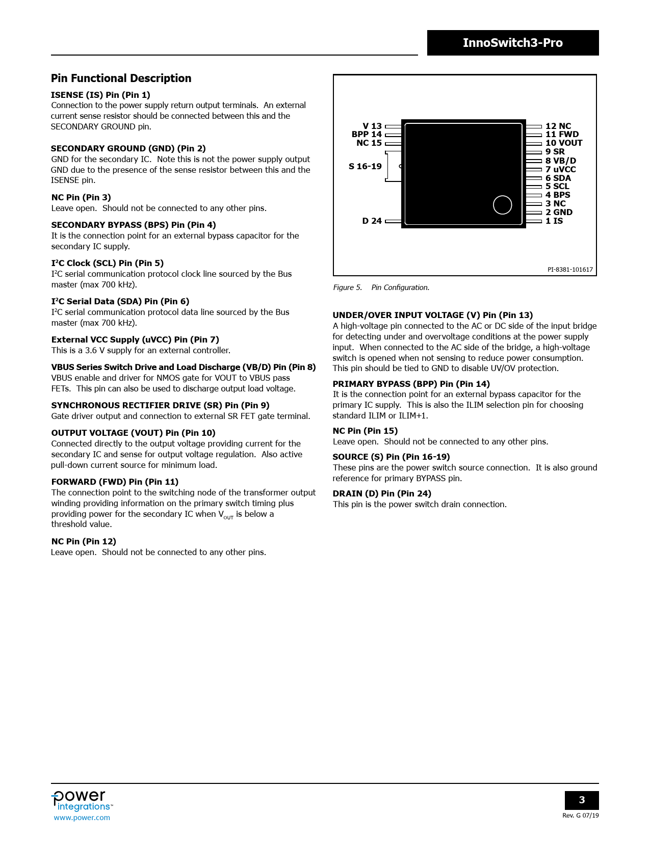 InnoSwitch3-ProPin Functional Description ISENSE (IS) Pin (Pin 1) Connection to the power supply return output terminals. An external current sense resistor should be connected between this and the SECONDARY GROUND pin. V 1312 NCBPP 1411 FWDSECONDARY GROUND (GND) (Pin 2)NC 1510 VOUT9 SR GND for the secondary IC. Note this is not the power supply output 8 VB/D GND due to the presence of the sense resistor between this and the S 16-197 uVCC ISENSE pin. 6 SDA5 SCLNC Pin (Pin 3)4 BPS Leave open. Should not be connected to any other pins. 3 NC2 GNDSECONDARY BYPASS (BPS) Pin (Pin 4)D 241 IS It is the connection point for an external bypass capacitor for the secondary IC supply. I2C Clock (SCL) Pin (Pin 5) I2C serial communication protocol clock line sourced by the Bus PI-8381-101617 master (max 700 kHz). Figure 5. Pin Configuration. I2C Serial Data (SDA) Pin (Pin 6) I2C serial communication protocol data line sourced by the Bus UNDER/OVER INPUT VOLTAGE (V) Pin (Pin 13) master (max 700 kHz). A high-voltage pin connected to the AC or DC side of the input bridge External VCC Supply (uVCC) Pin (Pin 7) for detecting under and overvoltage conditions at the power supply This is a 3.6 V supply for an external control er. input. When connected to the AC side of the bridge, a high-voltage switch is opened when not sensing to reduce power consumption. VBUS Series Switch Drive and Load Discharge (VB/D) Pin (Pin 8) This pin should be tied to GND to disable UV/OV protection. VBUS enable and driver for NMOS gate for VOUT to VBUS pass FETs. This pin can also be used to discharge output load voltage. PRIMARY BYPASS (BPP) Pin (Pin 14) It is the connection point for an external bypass capacitor for the SYNCHRONOUS RECTIFIER DRIVE (SR) Pin (Pin 9) primary IC supply. This is also the ILIM selection pin for choosing Gate driver output and connection to external SR FET gate terminal. standard ILIM or ILIM+1. OUTPUT VOLTAGE (VOUT) Pin (Pin 10)NC Pin (Pin 15) Connected directly to the output voltage providing current for the Leave open. Should not be connected to any other pins. secondary IC and sense for output voltage regulation. Also active SOURCE (S) Pin (Pin 16-19) pul -down current source for minimum load. These pins are the power switch source connection. It is also ground FORWARD (FWD) Pin (Pin 11) reference for primary BYPASS pin. The connection point to the switching node of the transformer output DRAIN (D) Pin (Pin 24) winding providing information on the primary switch timing plus This pin is the power switch drain connection. providing power for the secondary IC when V is below a OUT threshold value. NC Pin (Pin 12) Leave open. Should not be connected to any other pins. 3 Rev. G 07/19 www.power.com Document Outline Product Highlights Description Output Power Table Pin Functional Description InnoSwitch3-Pro Functional Description Primary Controller Secondary Controller Register Definition Command Registers Telemetry (Read-back) Registers I2C Connection I2C Example Waveforms Applications Example Key application Considerations Selection of Components Components for InnoSwitch3-Pro IC Primary-Side Circuit Components for InnoSwitch3-PRO Secondary-Side Circuit Recommendations for Circuit Board Layout Layout Example Recommendations for Transformer Design Application Considerations for INN3379C and INN3370C Only Quick Design Checklist Theremal Resistance Test Conditions for INN3379C and INN3370C Absolute Maximum Ratings Thermal Resistance Key Electrical Characteristics Typical Performance Curves InSOP-24D Package Drawing Part Ordering Table MSL Table ESD and Latch-Up Table Part Ordering Information