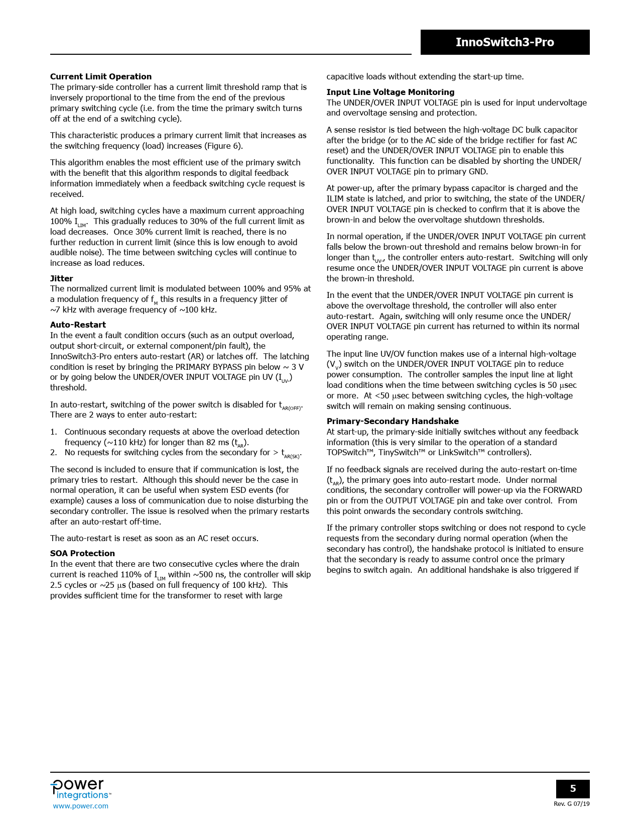 InnoSwitch3-ProCurrent Limit Operation capacitive loads without extending the start-up time. The primary-side control er has a current limit threshold ramp that is Input Line Voltage Monitoring inversely proportional to the time from the end of the previous The UNDER/OVER INPUT VOLTAGE pin is used for input undervoltage primary switching cycle (i.e. from the time the primary switch turns and overvoltage sensing and protection. off at the end of a switching cycle). A sense resistor is tied between the high-voltage DC bulk capacitor This characteristic produces a primary current limit that increases as after the bridge (or to the AC side of the bridge rectifier for fast AC the switching frequency (load) increases (Figure 6). reset) and the UNDER/OVER INPUT VOLTAGE pin to enable this This algorithm enables the most efficient use of the primary switch functionality. This function can be disabled by shorting the UNDER/ with the benefit that this algorithm responds to digital feedback OVER INPUT VOLTAGE pin to primary GND. information immediately when a feedback switching cycle request is At power-up, after the primary bypass capacitor is charged and the received. ILIM state is latched, and prior to switching, the state of the UNDER/ At high load, switching cycles have a maximum current approaching OVER INPUT VOLTAGE pin is checked to confirm that it is above the 100% I . This gradual y reduces to 30% of the full current limit as brown-in and below the overvoltage shutdown thresholds. LIM load decreases. Once 30% current limit is reached, there is no In normal operation, if the UNDER/OVER INPUT VOLTAGE pin current further reduction in current limit (since this is low enough to avoid fal s below the brown-out threshold and remains below brown-in for audible noise). The time between switching cycles will continue to longer than t , the control er enters auto-restart. Switching will only increase as load reduces. UV- resume once the UNDER/OVER INPUT VOLTAGE pin current is above Jitter the brown-in threshold. The normalized current limit is modulated between 100% and 95% at a modulation frequency of f this results in a frequency jitter of In the event that the UNDER/OVER INPUT VOLTAGE pin current is M ~7 kHz with average frequency of ~100 kHz. above the overvoltage threshold, the control er will also enter auto-restart. Again, switching will only resume once the UNDER/ Auto-Restart OVER INPUT VOLTAGE pin current has returned to within its normal In the event a fault condition occurs (such as an output overload, operating range. output short-circuit, or external component/pin fault), the InnoSwitch3-Pro enters auto-restart (AR) or latches off. The latching The input line UV/OV function makes use of a internal high-voltage condition is reset by bringing the PRIMARY BYPASS pin below ~ 3 V (V ) switch on the UNDER/OVER INPUT VOLTAGE pin to reduce V or by going below the UNDER/OVER INPUT VOLTAGE pin UV (I ) power consumption. The control er samples the input line at light UV- threshold. load conditions when the time between switching cycles is 50 msec or more. At <50 msec between switching cycles, the high-voltage In auto-restart, switching of the power switch is disabled for t . AR(OFF) switch will remain on making sensing continuous. There are 2 ways to enter auto-restart: Primary-Secondary Handshake 1. Continuous secondary requests at above the overload detection At start-up, the primary-side initial y switches without any feedback frequency (~110 kHz) for longer than 82 ms (t ). information (this is very similar to the operation of a standard AR 2. No requests for switching cycles from the secondary for > t . TOPSwitch™, TinySwitch™ or LinkSwitch™ control ers). AR(SK) The second is included to ensure that if communication is lost, the If no feedback signals are received during the auto-restart on-time primary tries to restart. Although this should never be the case in (t ), the primary goes into auto-restart mode. Under normal AR normal operation, it can be useful when system ESD events (for conditions, the secondary control er will power-up via the FORWARD example) causes a loss of communication due to noise disturbing the pin or from the OUTPUT VOLTAGE pin and take over control. From secondary control er. The issue is resolved when the primary restarts this point onwards the secondary controls switching. after an auto-restart off-time. If the primary control er stops switching or does not respond to cycle The auto-restart is reset as soon as an AC reset occurs. requests from the secondary during normal operation (when the SOA Protection secondary has control), the handshake protocol is initiated to ensure In the event that there are two consecutive cycles where the drain that the secondary is ready to assume control once the primary current is reached 110% of I within ~500 ns, the control er will skip begins to switch again. An additional handshake is also triggered if LIM 2.5 cycles or ~25 ms (based on full frequency of 100 kHz). This provides sufficient time for the transformer to reset with large 5 Rev. G 07/19 www.power.com Document Outline Product Highlights Description Output Power Table Pin Functional Description InnoSwitch3-Pro Functional Description Primary Controller Secondary Controller Register Definition Command Registers Telemetry (Read-back) Registers I2C Connection I2C Example Waveforms Applications Example Key application Considerations Selection of Components Components for InnoSwitch3-Pro IC Primary-Side Circuit Components for InnoSwitch3-PRO Secondary-Side Circuit Recommendations for Circuit Board Layout Layout Example Recommendations for Transformer Design Application Considerations for INN3379C and INN3370C Only Quick Design Checklist Theremal Resistance Test Conditions for INN3379C and INN3370C Absolute Maximum Ratings Thermal Resistance Key Electrical Characteristics Typical Performance Curves InSOP-24D Package Drawing Part Ordering Table MSL Table ESD and Latch-Up T