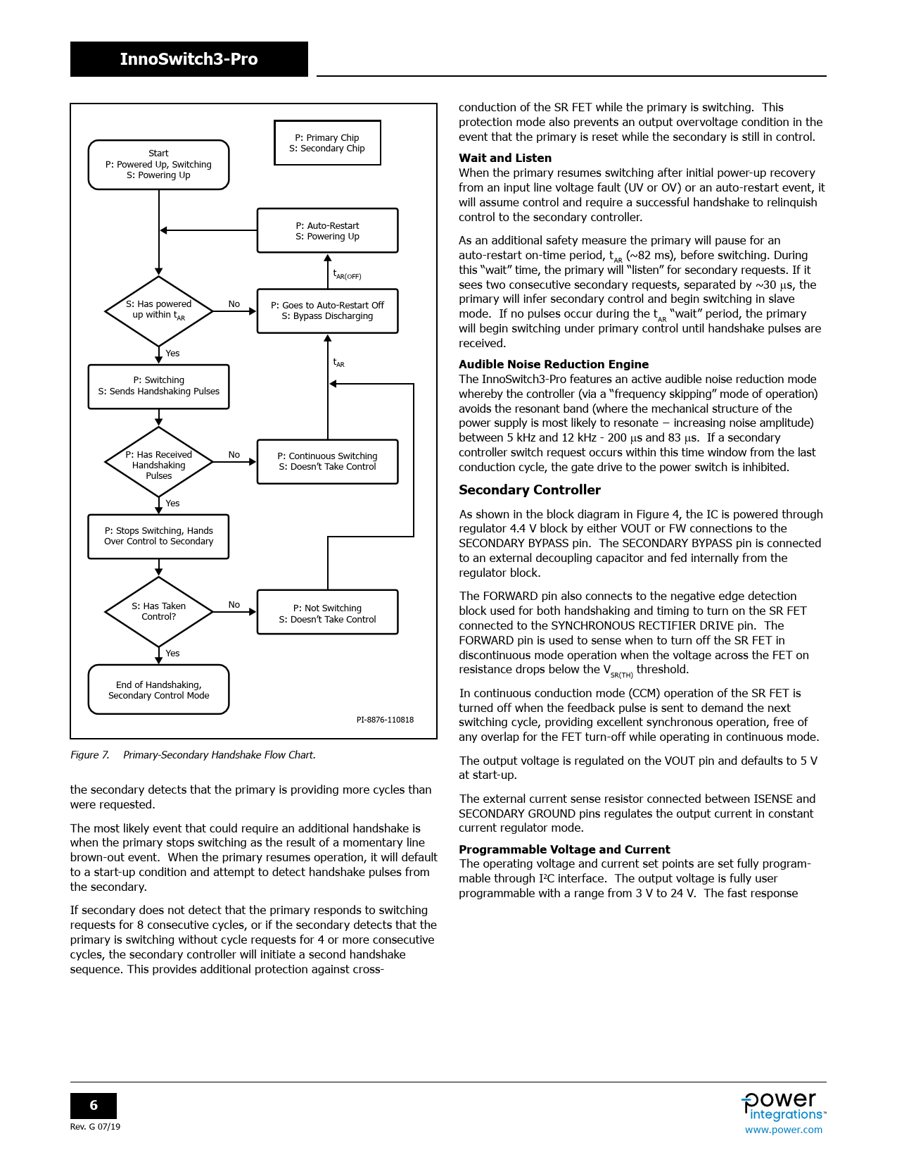 InnoSwitch3-Pro conduction of the SR FET while the primary is switching. This protection mode also prevents an output overvoltage condition in the P: Primary Chip event that the primary is reset while the secondary is still in control. S: Secondary Chip Start Wait and Listen P: Powered Up, Switching S: Powering Up When the primary resumes switching after initial power-up recovery from an input line voltage fault (UV or OV) or an auto-restart event, it will assume control and require a successful handshake to relinquish control to the secondary control er. P: Auto-Restart S: Powering Up As an additional safety measure the primary will pause for an auto-restart on-time period, t (~82 ms), before switching. During AR t this “wait” time, the primary will “listen” for secondary requests. If it AR(OFF) sees two consecutive secondary requests, separated by ~30 ms, the primary will infer secondary control and begin switching in slave S: Has powered No P: Goes to Auto-Restart Off up within tAR S: Bypass Discharging mode. If no pulses occur during the t “wait” period, the primary AR will begin switching under primary control until handshake pulses are received. Yes tAR Audible Noise Reduction Engine P: Switching The InnoSwitch3-Pro features an active audible noise reduction mode S: Sends Handshaking Pulses whereby the control er (via a “frequency skipping” mode of operation) avoids the resonant band (where the mechanical structure of the power supply is most likely to resonate − increasing noise amplitude) between 5 kHz and 12 kHz - 200 ms and 83 ms. If a secondary P: Has Received No P: Continuous Switching control er switch request occurs within this time window from the last Handshaking S: Doesn’t Take Control conduction cycle, the gate drive to the power switch is inhibited. Pulses Secondary Controller Yes As shown in the block diagram in Figure 4, the IC is powered through P: Stops Switching, Hands regulator 4.4 V block by either VOUT or FW connections to the Over Control to Secondary SECONDARY BYPASS pin. The SECONDARY BYPASS pin is connected to an external decoupling capacitor and fed internal y from the regulator block. The FORWARD pin also connects to the negative edge detection S: Has Taken No P: Not Switching block used for both handshaking and timing to turn on the SR FET Control? S: Doesn’t Take Control connected to the SYNCHRONOUS RECTIFIER DRIVE pin. The FORWARD pin is used to sense when to turn off the SR FET in Yes discontinuous mode operation when the voltage across the FET on resistance drops below the V threshold. SR(TH) End of Handshaking, Secondary Control Mode In continuous conduction mode (CCM) operation of the SR FET is turned off when the feedback pulse is sent to demand the next PI-8876-110818 switching cycle, providing excel ent synchronous operation, free of any overlap for the FET turn-off while operating in continuous mode. Figure 7. Primary-Secondary Handshake Flow Chart. The output voltage is regulated on the VOUT pin and defaults to 5 V at start-up. the secondary detects that the primary is providing more cycles than were requested. The external current sense resistor connected between ISENSE and SECONDARY GROUND pins regulates the output current in constant The most likely event that could require an additional handshake is current regulator mode. when the primary stops switching as the result of a momentary line Programmable Voltage and Current brown-out event. When the primary resumes operation, it will default The operating voltage and current set points are set ful y program- to a start-up condition and attempt to detect handshake pulses from mable through I2C interface. The output voltage is fully user the secondary. programmable with a range from 3 V to 24 V. The fast response If secondary does not detect that the primary responds to switching requests for 8 consecutive cycles, or if the secondary detects that the primary is switching without cycle requests for 4 or more consecutive cycles, the secondary control er will initiate a second handshake sequence. This provides additional protection against cross- 6 Rev. G 07/19 www.power.com Document Outline Product Highlights Description Output Power Table Pin Functional Description InnoSwitch3-Pro Functional Description Primary Controller Secondary Controller Register Definition Command Registers Telemetry (Read-back) Registers I2C Connection I2C Example Waveforms Applications Example Key application Considerations Selection of Components Components for InnoSwitch3-Pro IC Primary-Side Circuit Components for InnoSwitch3-PRO Secondary-Side Circuit Recommendations for Circuit Board Layout Layout Example Recommendations for Transformer Design Application Considerations for INN3379C and INN3370C Only Quick Design Checklist Theremal Resistance Test Conditions for INN3379C and INN3370C Absolute Maximum Ratings Thermal Resistance Key Electrical Characteristics Typical Performance Curves InSOP-24D Package Drawing Part Ordering Table MSL Table ESD and Latch-Up Table Part Ordering Information