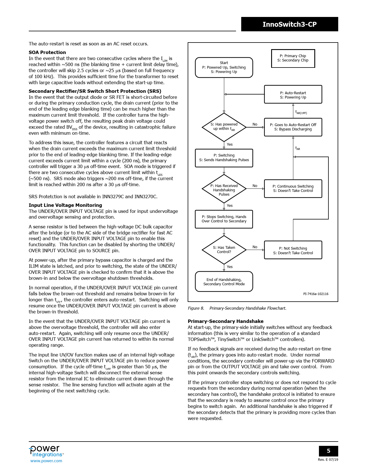 InnoSwitch3-CP The auto-restart is reset as soon as an AC reset occurs. SOA Protection In the event that there are two consecutive cycles where the I is P: Primary Chip LIM S: Secondary Chip reached within ~500 ns (the blanking time + current limit delay time), Start P: Powered Up, Switching the control er will skip 2.5 cycles or ~25 ms (based on full frequency S: Powering Up of 100 kHz). This provides sufficient time for the transformer to reset with large capacitive loads without extending the start-up time. Secondary Rectifier/SR Switch Short Protection (SRS) P: Auto-Restart In the event that the output diode or SR FET is short-circuited before S: Powering Up or during the primary conduction cycle, the drain current (prior to the end of the leading edge blanking time) can be much higher than the t maximum current limit threshold. If the control er turns the high- AR(OFF) voltage power switch off, the resulting peak drain voltage could exceed the rated BV of the device, resulting in catastrophic failure S: Has powered No P: Goes to Auto-Restart Off DSS up within t S: Bypass Discharging even with minimum on-time. AR To address this issue, the control er features a circuit that reacts Yes when the drain current exceeds the maximum current limit threshold tAR prior to the end of leading-edge blanking time. If the leading-edge P: Switching current exceeds current limit within a cycle (200 ns), the primary S: Sends Handshaking Pulses control er will trigger a 30 ms off-time event. SOA mode is triggered if there are two consecutive cycles above current limit within t LES (~500 ns). SRS mode also triggers ~200 ms off-time, if the current limit is reached within 200 ns after a 30 ms off-time. P: Has Received No P: Continuous Switching Handshaking S: Doesn’t Take Control SRS Protetction is not available in INN3279C and INN3270C. Pulses Input Line Voltage Monitoring Yes The UNDER/OVER INPUT VOLTAGE pin is used for input undervoltage and overvoltage sensing and protection. P: Stops Switching, Hands Over Control to Secondary A sense resistor is tied between the high-voltage DC bulk capacitor after the bridge (or to the AC side of the bridge rectifier for fast AC reset) and the UNDER/OVER INPUT VOLTAGE pin to enable this functionality. This function can be disabled by shorting the UNDER/ S: Has Taken No OVER INPUT VOLTAGE pin to SOURCE pin. P: Not Switching Control? S: Doesn’t Take Control At power-up, after the primary bypass capacitor is charged and the ILIM state is latched, and prior to switching, the state of the UNDER/ Yes OVER INPUT VOLTAGE pin is checked to confirm that it is above the brown-in and below the overvoltage shutdown thresholds. End of Handshaking, Secondary Control Mode In normal operation, if the UNDER/OVER INPUT VOLTAGE pin current fal s below the brown-out threshold and remains below brown-in for PI-7416a-102116 longer than t , the control er enters auto-restart. Switching will only UV- resume once the UNDER/OVER INPUT VOLTAGE pin current is above Figure 8. Primary-Secondary Handshake Flowchart. the brown-in threshold. In the event that the UNDER/OVER INPUT VOLTAGE pin current is Primary-Secondary Handshake above the overvoltage threshold, the control er will also enter At start-up, the primary-side initial y switches without any feedback auto-restart. Again, switching will only resume once the UNDER/ information (this is very similar to the operation of a standard OVER INPUT VOLTAGE pin current has returned to within its normal TOPSwitch™, TinySwitch™ or LinkSwitch™ control ers). operating range. If no feedback signals are received during the auto-restart on-time The input line UV/OV function makes use of an internal high-voltage (t ), the primary goes into auto-restart mode. Under normal AR Switch on the UNDER/OVER INPUT VOLTAGE pin to reduce power conditions, the secondary control er will power-up via the FORWARD consumption. If the cycle off-time t is greater than 50 ms, the pin or from the OUTPUT VOLTAGE pin and take over control. From OFF internal high-voltage Switch will disconnect the external sense this point onwards the secondary controls switching. resistor from the internal IC to eliminate current drawn through the sense resistor. The line sensing function will activate again at the If the primary control er stops switching or does not respond to cycle beginning of the next switching cycle. requests from the secondary during normal operation (when the secondary has control), the handshake protocol is initiated to ensure that the secondary is ready to assume control once the primary begins to switch again. An additional handshake is also triggered if the secondary detects that the primary is providing more cycles than were requested. 5 Rev. E 07/19 www.power.com Document Outline Product Highlights Description Output Power Table Pin Functional Description InnoSwitch3-CP Functional Description Primary Controller Secondary Controller Applications Example Key Application Considerations Selection of Components Recommendations for Circuit Board Layout Layout Example Quick Design Checklist Absolute Maximum Ratings Thermal Resistance Typical Performance Curves InSOP-24D Package Drawing InSOP-24D Package Marking Part Ordering Table MSL Table ESD and Latch-Up Table Part Ordering Information