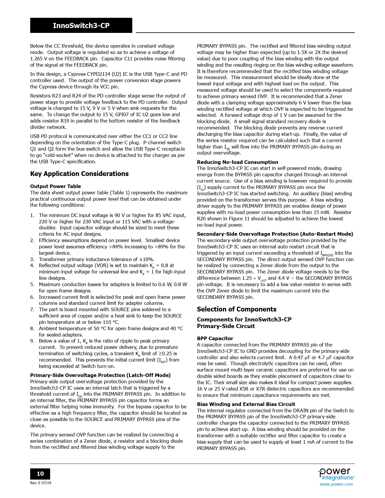 InnoSwitch3-CP Below the CC threshold, the device operates in constant voltage PRIMARY BYPASS pin. The rectified and filtered bias winding output mode. Output voltage is regulated so as to achieve a voltage of voltage may be higher than expected (up to 1.5X or 2X the desired 1.265 V on the FEEDBACK pin. Capacitor C11 provides noise filtering value) due to poor coupling of the bias winding with the output of the signal at the FEEDBACK pin. winding and the resulting ringing on the bias winding voltage waveform. In this design, a Cypress CYPD2134 (U2) IC is the USB Type-C and PD It is therefore recommended that the rectified bias winding voltage control er used. The output of the power conversion stage powers be measured. This measurement should be ideal y done at the the Cypress device through its VCC pin. lowest input voltage and with highest load on the output. This measured voltage should be used to select the components required Resistors R23 and R24 of the PD control er stage sense the output of to achieve primary sensed OVP. It is recommended that a Zener power stage to provide voltage feedback to the PD control er. Output diode with a clamping voltage approximately 6 V lower than the bias voltage is changed to 15 V, 9 V or 5 V when sink requests for the winding rectified voltage at which OVP is expected to be triggered be same. To change the output to 15 V, GPI07 of IC U2 goes low and selected. A forward voltage drop of 1 V can be assumed for the adds resistor R19 in paral el to the bottom resistor of the feedback blocking diode. A small signal standard recovery diode is divider network. recommended. The blocking diode prevents any reverse current USB PD protocol is communicated over either the CC1 or CC2 line discharging the bias capacitor during start-up. Final y, the value of depending on the orientation of the Type-C plug. P-channel switch the series resistor required can be calculated such that a current Q1 and Q2 form the bus-switch and al ow the USB Type-C receptacle higher than I will flow into the PRIMARY BYPASS pin during an SD to go “cold-socket” when no device is attached to the charger as per output overvoltage. the USB Type-C specification. Reducing No-load Consumption The InnoSwitch3-CP IC can start in self-powered mode, drawing Key Application Considerations energy from the BYPASS pin capacitor charged through an internal current source. Use of a bias winding is however required to provide Output Power Table (I ) supply current to the PRIMARY BYPASS pin once the The data sheet output power table (Table 1) represents the maximum S1 InnoSwitch3-CP IC has started switching. An auxiliary (bias) winding practical continuous output power level that can be obtained under provided on the transformer serves this purpose. A bias winding the fol owing conditions: driver supply to the PRIMARY BYPASS pin enables design of power 1. The minimum DC input voltage is 90 V or higher for 85 VAC input, supplies with no-load power consumption less than 15 mW. Resistor 220 V or higher for 230 VAC input or 115 VAC with a voltage- R20 shown in Figure 11 should be adjusted to achieve the lowest doubler. Input capacitor voltage should be sized to meet these no-load input power. criteria for AC input designs. Secondary-Side Overvoltage Protection (Auto-Restart Mode) 2. Efficiency assumptions depend on power level. Smallest device The secondary-side output overvoltage protection provided by the power level assumes efficiency >84% increasing to >89% for the InnoSwitch3-CP IC uses an internal auto restart circuit that is largest device. triggered by an input current exceeding a threshold of I into the BPS(SD) 3. Transformer primary inductance tolerance of ±10%. SECONDARY BYPASS pin. The direct output sensed OVP function can 4. Reflected output voltage (VOR) is set to maintain K = 0.8 at be realized by connecting a Zener diode from the output to the P minimum input voltage for universal line and K = 1 for high input SECONDARY BYPASS pin. The Zener diode voltage needs to be the P line designs. difference between 1.25 × V and 4.4 V − the SECONDARY BYPASS OUT 5. Maximum conduction losses for adapters is limited to 0.6 W, 0.8 W pin voltage. It is necessary to add a low value resistor in series with for open frame designs. the OVP Zener diode to limit the maximum current into the 6. Increased current limit is selected for peak and open frame power SECONDARY BYPASS pin. columns and standard current limit for adapter columns. 7. The part is board mounted with SOURCE pins soldered to a Selection of Components sufficient area of copper and/or a heat sink to keep the SOURCE pin temperature at or below 110 °C. Components for InnoSwitch3-CP 8. Ambient temperature of 50 °C for open frame designs and 40 °C Primary-Side Circuit for sealed adapters. 9. Below a value of 1, K is the ratio of ripple to peak primary BPP Capacitor P current. To prevent reduced power delivery, due to premature A capacitor connected from the PRIMARY BYPASS pin of the termination of switching cycles, a transient K limit of ≥0.25 is InnoSwitch3-CP IC to GND provides decoupling for the primary-side P recommended. This prevents the initial current limit (I ) from control er and also selects current limit. A 0.47 mF or 4.7 mF capacitor INT being exceeded at Switch turn-on. may be used. Though electrolytic capacitors can be used, often surface mount multi-layer ceramic capacitors are preferred for use on Primary-Side Overvoltage Protection (Latch-Off Mode) double sided boards as they enable placement of capacitors close to Primary-side output overvoltage protection provided by the the IC. Their smal size also makes it ideal for compact power supplies. InnoSwitch3-CP IC uses an internal latch that is triggered by a 16 V or 25 V rated X5R or X7R dielectric capacitors are recommended threshold current of I into the PRIMARY BYPASS pin. In addition to SD to ensure that minimum capacitance requirements are met. an internal filter, the P