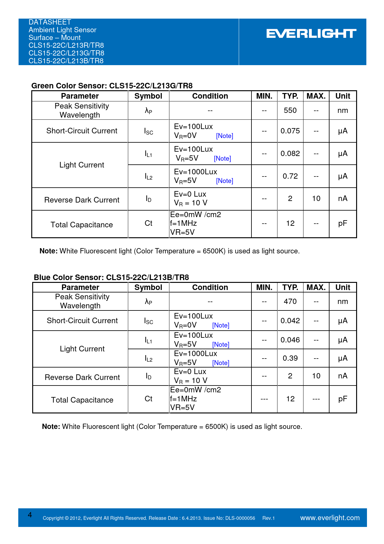 Green Color Sensor: CLS15-22C/L213G/TR8. Parameter. Symbol. Condition. MIN. TYP. MAX. Unit. Note: