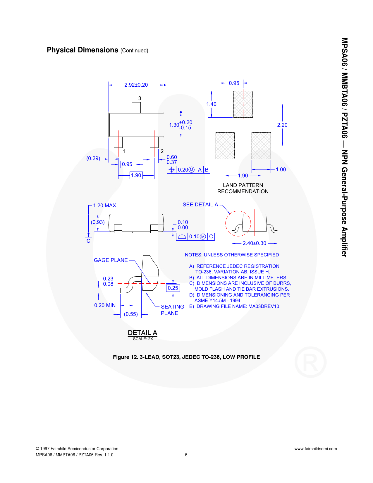 PLANE SCALE: 2X Figure 12. 3-LEAD, SOT23, JEDEC TO-236, LOW PROFILE © 1997 Fairchild Semiconductor Corporation
