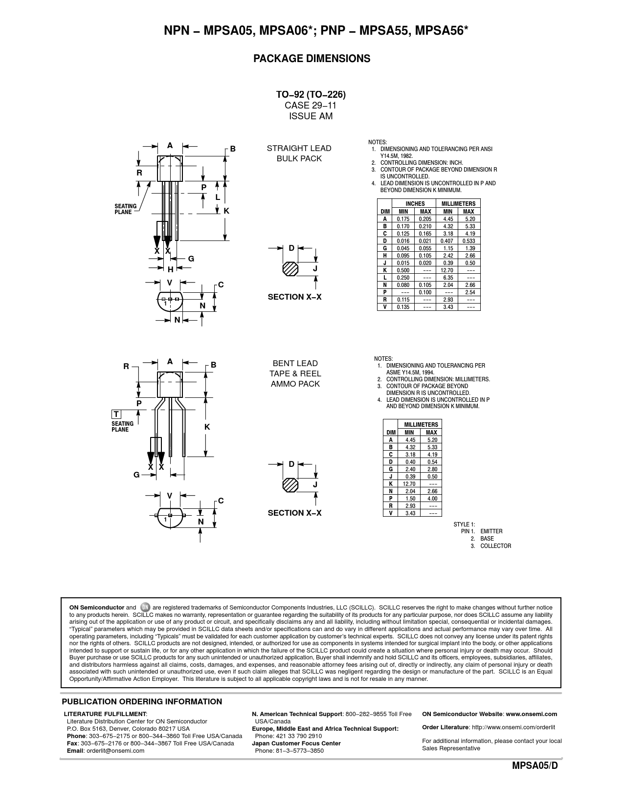 NPN − MPSA05, MPSA06*; PNP − MPSA55, MPSA56*PACKAGE DIMENSIONSTO−92 (TO−226) CASE 29−11 ISSUE AM NOTES: AB STRAIGHT LEAD 1. DIMENSIONING AND TOLERANCING PER ANSI Y14.5M, 1982. BULK PACK 2. CONTROLLING DIMENSION: INCH. 3. CONTOUR OF PACKAGE BEYOND DIMENSION R R IS UNCONTROLLED. 4. LEAD DIMENSION IS UNCONTROLLED IN P AND P BEYOND DIMENSION K MINIMUM. L SEATING INCHES MILLIMETERS PLANE K DIM MIN MAX MIN MAX A 0.175 0.205 4.45 5.20 B 0.170 0.210 4.32 5.33 C 0.125 0.165 3.18 4.19 D 0.016 0.021 0.407 0.533 DX X G 0.045 0.055 1.15 1.39 G H 0.095 0.105 2.42 2.66 J 0.015 0.020 0.39 0.50 HJ K 0.500 −−− 12.70 −−− L 0.250 −−− 6.35 −−− VC N 0.080 0.105 2.04 2.66 P −−− 0.100 −−− 2.54 SECTION X−X R 0.115 −−− 2.93 −−− 1 N V 0.135 −−− 3.43 −−− N NOTES: ARB BENT LEAD 1. DIMENSIONING AND TOLERANCING PER ASME Y14.5M, 1994. TAPE & REEL 2. CONTROLLING DIMENSION: MILLIMETERS. AMMO PACK 3. CONTOUR OF PACKAGE BEYOND DIMENSION R IS UNCONTROLLED. 4. LEAD DIMENSION IS UNCONTROLLED IN P P AND BEYOND DIMENSION K MINIMUM. T SEATING K MILLIMETERS PLANE DIM MIN MAX A 4.45 5.20 B 4.32 5.33 C 3.18 4.19 D D 0.40 0.54 X X G 2.40 2.80 G J 0.39 0.50 J K 12.70 −−− N 2.04 2.66 VC P 1.50 4.00 R 2.93 −−− SECTION X−X V 3.43 −−− 1 N STYLE 1: PIN 1. EMITTER 2. BASE 3. COLLECTOR ON Semiconductor and are registered trademarks of Semiconductor Components Industries, LLC (SCILLC). SCILLC reserves the right to make changes without further notice to any products herein. SCILLC makes no warranty, representation or guarantee regarding the suitability of its products for any particular purpose, nor does SCILLC assume any liability arising out of the application or use of any product or circuit, and specifically disclaims any and all liability, including without limitation special, consequential or incidental damages. “Typical” parameters which may be provided in SCILLC data sheets and/or specifications can and do vary in different applications and actual performance may vary over time. All operating parameters, including “Typicals” must be validated for each customer application by customer’s technical experts. SCILLC does not convey any license under its patent rights nor the rights of others. SCILLC products are not designed, intended, or authorized for use as components in systems intended for surgical implant into the body, or other applications intended to support or sustain life, or for any other application in which the failure of the SCILLC product could create a situation where personal injury or death may occur. Should Buyer purchase or use SCILLC products for any such unintended or unauthorized application, Buyer shall indemnify and hold SCILLC and its officers, employees, subsidiaries, affiliates, and distributors harmless against all claims, costs, damages, and expenses, and reasonable attorney fees arising out of, directly or indirectly, any claim of personal injury or death associated with such unintended or unauthorized use, even if such claim alleges that SCILLC was negligent regarding the design or manufacture of the part. SCILLC is an Equal Opportunity/Affirmative Action Employer. This literature is subject to all applicable copyright laws and is not for resale in any manner. PUBLICATION ORDERING INFORMATIONLITERATURE FULFILLMENT : N. American Technical Support : 800−282−9855 Toll Free ON Semiconductor Website : www.onsemi.com Literature Distribution Center for ON Semiconductor USA/Canada P.O. Box 5163, Denver, Colorado 80217 USA Europe, Middle East and Africa Technical Support:Order Literature : http://www.onsemi.com/orderlit Phone : 303−675−2175 or 800−344−3860 Toll Free USA/Canada Phone: 421 33 790 2910 Fax : 303−675−2176 or 800−344−3867 Toll Free USA/Canada Japan Customer Focus Center For additional information, please contact your local Email : orderlit@onsemi.com Phone: 81−3−5773−3850 Sales Representative http://onsemi.comMPSA05/D7