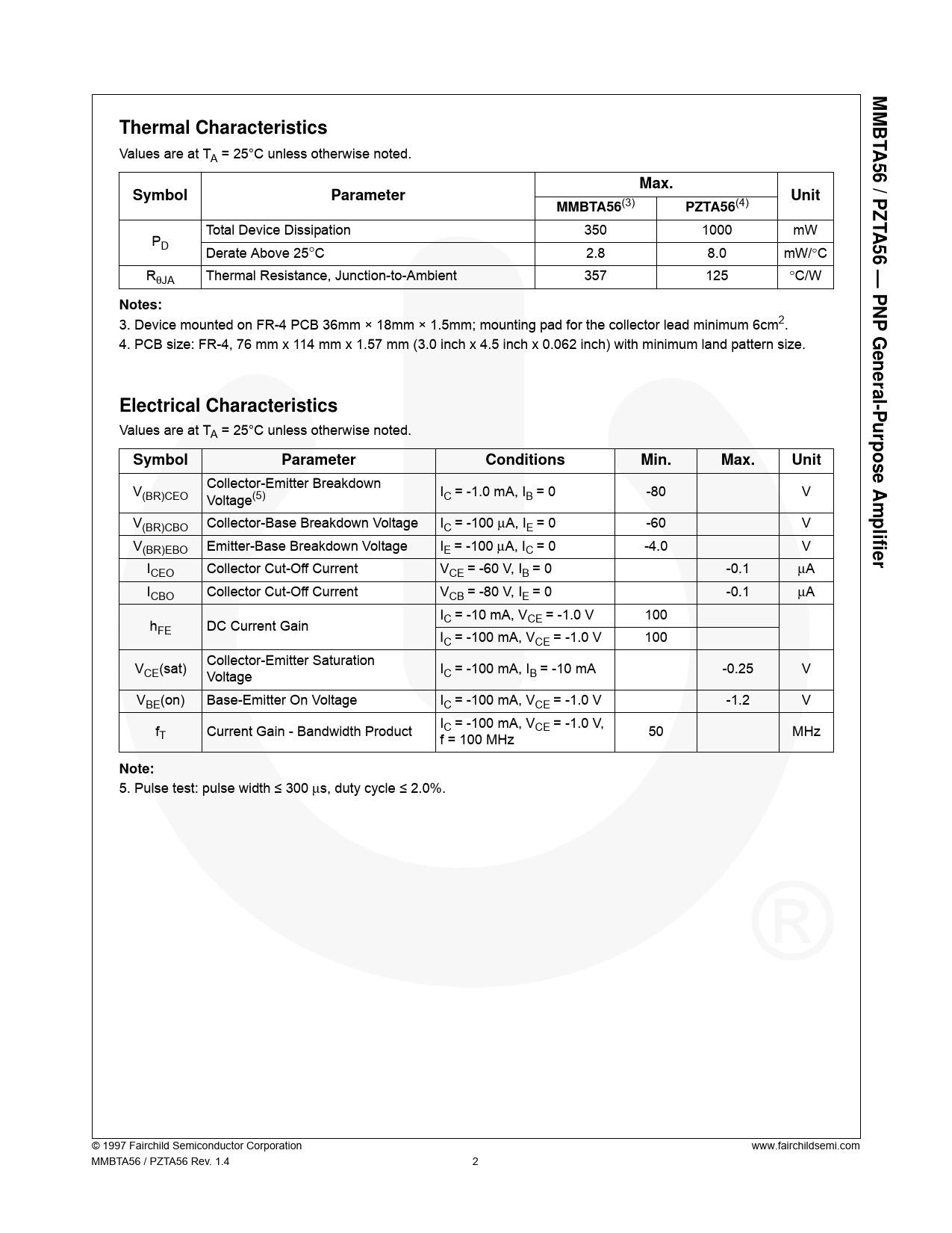 RθJA Max. Parameter (3) Unit PZTA56(4) MMBTA56 Total Device Dissipation 350 1000 mW Derate Above 25°C 2.8 8.0 mW/°C Thermal Resistance, Junction-to-Ambient 357 125 °C/W Notes: