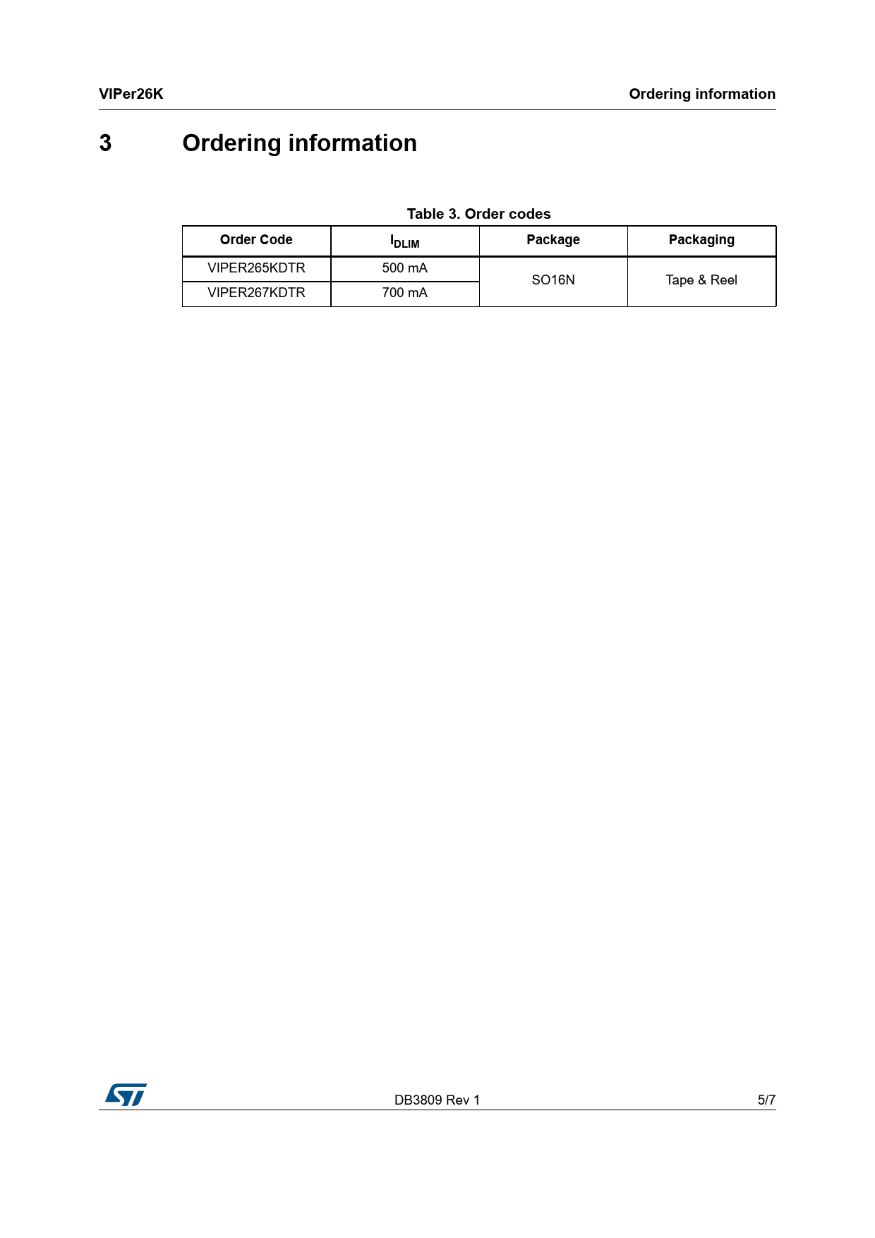 | Páginas / Página | 7 / 5 — VIPer26K. Ordering information. Table 3. Order codes. Order Code. IDLIM. … |