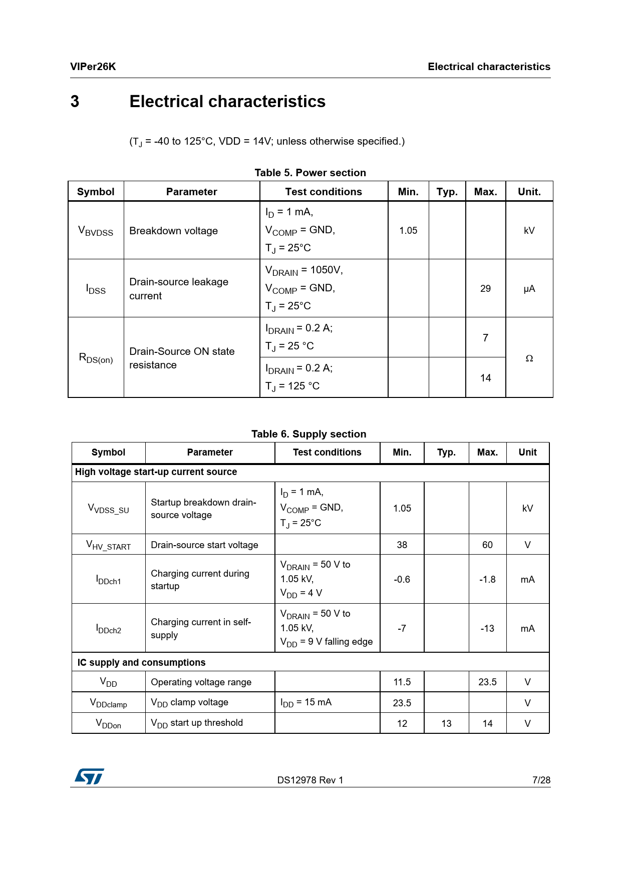 | Páginas / Página | 28 / 7 — VIPer26K. Electrical characteristics. Table 5. Power section. Symbol. … |