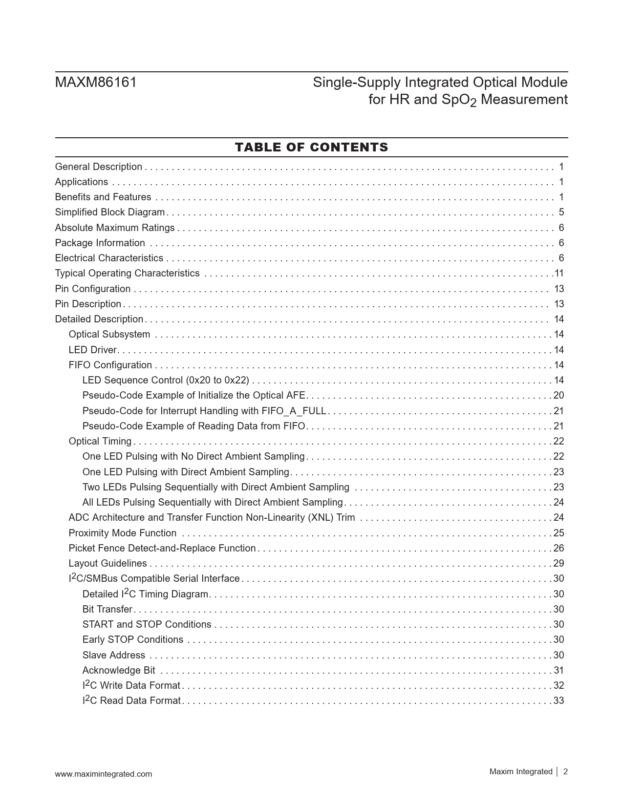 link to page 1 link to page 1 link to page 1 link to page 5 link to page 6 link to page 6 link to page 6 link to page 11 link to page 13 link to page 13 link to page 14 link to page 14 link to page 14 link to page 14 link to page 14 link to page 20 link to page 21 link to page 21 link to page 22 link to page 22 link to page 23 link to page 23 link to page 24 link to page 24 link to page 25 link to page 26 link to page 29 link to page 30 link to page 30 link to page 30 link to page 30 link to page 30 link to page 30 link to page 31 link to page 32 link to page 33 MAXM86161 Single-Supply Integrated Optical Module for HR and SpO2 Measurement TABLE OF CONTENTS General Description . 1 Applications . 1 Benefits and Features . 1 Simplified Block Diagram. 5 Absolute Maximum Ratings . 6 Package Information . 6 Electrical Characteristics . 6 Typical Operating Characteristics . .11 Pin Configuration . 13 Pin Description . 13 Detailed Description. 14 Optical Subsystem . 14 LED Driver. 14 FIFO Configuration . 14 LED Sequence Control (0x20 to 0x22) . 14 Pseudo-Code Example of Initialize the Optical AFE. 20 Pseudo-Code for Interrupt Handling with FIFO_A_FULL. 21 Pseudo-Code Example of Reading Data from FIFO. 21 Optical Timing . 22 One LED Pulsing with No Direct Ambient Sampling. 22 One LED Pulsing with Direct Ambient Sampling. 23 Two LEDs Pulsing Sequential y with Direct Ambient Sampling . 23 Al LEDs Pulsing Sequential y with Direct Ambient Sampling. 24 ADC Architecture and Transfer Function Non-Linearity (XNL) Trim . 24 Proximity Mode Function . 25 Picket Fence Detect-and-Replace Function . 26 Layout Guidelines . 29 I2C/SMBus Compatible Serial Interface . 30 Detailed I2C Timing Diagram. 30 Bit Transfer. 30 START and STOP Conditions . 30 Early STOP Conditions . 30 Slave Address . 30 Acknowledge Bit . 31 I2C Write Data Format . 32 I2C Read Data Format. 33 www.maximintegrated.com Maxim Integrated │ 2 Document Outline General Description Applications Benefits and Features Simplified Block Diagram Absolute Maximum Ratings Package Information Electrical Characteristics Typical Operating Characteristics Pin Configuration Pin Description Detailed Description Optical Subsystem LED Driver FIFO Configuration LED Sequence Control (0x20 to 0x22) Pseudo-Code Example of Initialize the Optical AFE Pseudo-Code for Interrupt Handling with FIFO_A_FULL Pseudo-Code Example of Reading Data from FIFO Optical Timing One LED Pulsing with No Direct Ambient Sampling One LED Pulsing with Direct Ambient Sampling Two LEDs Pulsing Sequentially with Direct Ambient Sampling All LEDs Pulsing Sequentially with Direct Ambient Sampling ADC Architecture and Transfer Function Non-Linearity (XNL) Trim Proximity Mode Function Picket Fence Detect-and-Replace Function Layout Guidelines I2C/SMBus Compatible Serial Interface Detailed I2C Timing Diagram Bit Transfer START and STOP Conditions Early STOP Conditions Slave Address Acknowledge Bit I2C Write Data Format I2C Read Data Format Register Map Register Details INTERRUPT STATUS 1 (0x00) INTERRUPT STATUS 2 (0X01) INTERRUPT ENABLE 1 (0X02) INTERRUPT ENABLE 2 (0X03) FIFO WRITE POINTER (0X04) FIFO READ POINTER (0X05) OVER FLOW COUNTER (0X06) FIFO DATA COUNTER (0X07) FIFO DATA REGISTER (0X08) FIFO CONFIGURATION 1 (0X09) FIFO CONFIGURATION 2 (0X0A) SYSTEM CONTROL (0X0D) PPG SYNC CONTROL (0X10) PPG CONFIGURATION 1 (0X11) PPG CONFIGURATION 2 (0X12) PPG CONFIGURATION 3 (0X13) PROX INTERRUPT THRESHOLD (0X14) PHOTO DIODE BIAS (0X15) PICKET FENCE (0X16) LED SEQUENCE REGISTER 1 (0X20) LED SEQUENCE REGISTER 2 (0X21) LED SEQUENCE REGISTER 3 (0X22) LED1 PA (0x23) LED2 PA (0x24) LED3_PA (0x25) LED PILOT PA (0x29) LED RANGE 1 (0X2A) S1 HI RES DAC1 (0x2C) S2 HI RES DAC1 (0x2D) S3 HI RES DAC1 (0x2E) S4 HI RES DAC1 (0x2F) S5 HI RES DAC1 (0x30) S6 HI RES DAC1 (0x31) DIE TEMPERATURE CONFIGURATION (0X40) DIE TEMPERATURE INTEGER (0X41) DIE TEMPERATURE FRACTION (0X42) DAC CALIBRATION ENABLE (0X50) SHA COMMAND (0XF0) SHA CONFIGURATION (0XF1) MEMORY CONTROL (0XF2) MEMORY INDEX (0XF3) MEMORY DATA (0XF4) PART ID (0XFF) Ordering Information Revision History