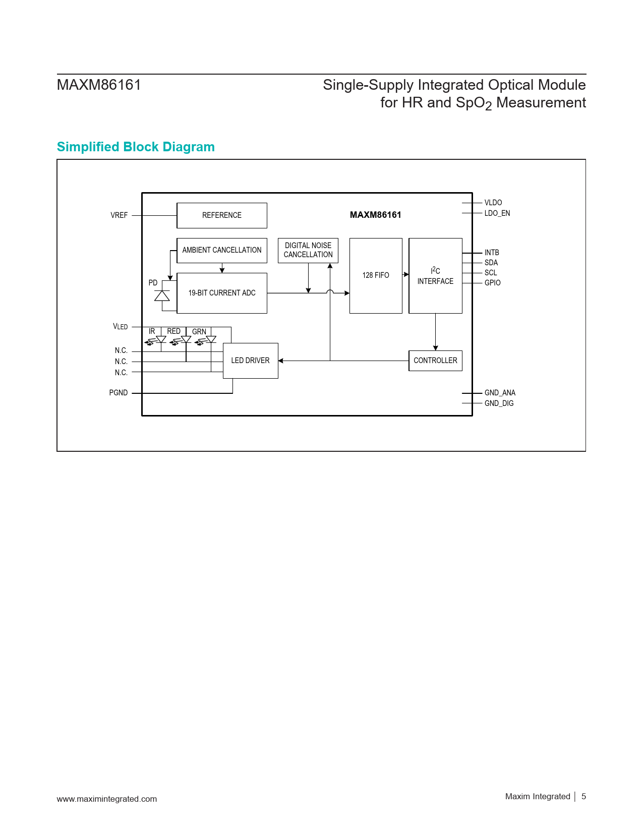 MAXM86161 Single-Supply Integrated Optical Module for HR and SpO2 Measurement Simplified Block Diagram VLDO VREF REFERENCE MAXM86161 LDO_EN DIGITAL NOISE AMBIENT CANCELLATION CANCELLATION INTB SDA 128 FIFO I2C SCL PD INTERFACE GPIO 19-BIT CURRENT ADC VLED IR RED GRN N.C. N.C. LED DRIVER CONTROLLER N.C. PGND GND_ANA GND_DIG www.maximintegrated.com Maxim Integrated │ 5 Document Outline General Description Applications Benefits and Features Simplified Block Diagram Absolute Maximum Ratings Package Information Electrical Characteristics Typical Operating Characteristics Pin Configuration Pin Description Detailed Description Optical Subsystem LED Driver FIFO Configuration LED Sequence Control (0x20 to 0x22) Pseudo-Code Example of Initialize the Optical AFE Pseudo-Code for Interrupt Handling with FIFO_A_FULL Pseudo-Code Example of Reading Data from FIFO Optical Timing One LED Pulsing with No Direct Ambient Sampling One LED Pulsing with Direct Ambient Sampling Two LEDs Pulsing Sequentially with Direct Ambient Sampling All LEDs Pulsing Sequentially with Direct Ambient Sampling ADC Architecture and Transfer Function Non-Linearity (XNL) Trim Proximity Mode Function Picket Fence Detect-and-Replace Function Layout Guidelines I2C/SMBus Compatible Serial Interface Detailed I2C Timing Diagram Bit Transfer START and STOP Conditions Early STOP Conditions Slave Address Acknowledge Bit I2C Write Data Format I2C Read Data Format Register Map Register Details INTERRUPT STATUS 1 (0x00) INTERRUPT STATUS 2 (0X01) INTERRUPT ENABLE 1 (0X02) INTERRUPT ENABLE 2 (0X03) FIFO WRITE POINTER (0X04) FIFO READ POINTER (0X05) OVER FLOW COUNTER (0X06) FIFO DATA COUNTER (0X07) FIFO DATA REGISTER (0X08) FIFO CONFIGURATION 1 (0X09) FIFO CONFIGURATION 2 (0X0A) SYSTEM CONTROL (0X0D) PPG SYNC CONTROL (0X10) PPG CONFIGURATION 1 (0X11) PPG CONFIGURATION 2 (0X12) PPG CONFIGURATION 3 (0X13) PROX INTERRUPT THRESHOLD (0X14) PHOTO DIODE BIAS (0X15) PICKET FENCE (0X16) LED SEQUENCE REGISTER 1 (0X20) LED SEQUENCE REGISTER 2 (0X21) LED SEQUENCE REGISTER 3 (0X22) LED1 PA (0x23) LED2 PA (0x24) LED3_PA (0x25) LED PILOT PA (0x29) LED RANGE 1 (0X2A) S1 HI RES DAC1 (0x2C) S2 HI RES DAC1 (0x2D) S3 HI RES DAC1 (0x2E) S4 HI RES DAC1 (0x2F) S5 HI RES DAC1 (0x30) S6 HI RES DAC1 (0x31) DIE TEMPERATURE CONFIGURATION (0X40) DIE TEMPERATURE INTEGER (0X41) DIE TEMPERATURE FRACTION (0X42) DAC CALIBRATION ENABLE (0X50) SHA COMMAND (0XF0) SHA CONFIGURATION (0XF1) MEMORY CONTROL (0XF2) MEMORY INDEX (0XF3) MEMORY DATA (0XF4) PART ID (0XFF) Ordering Information Revision History