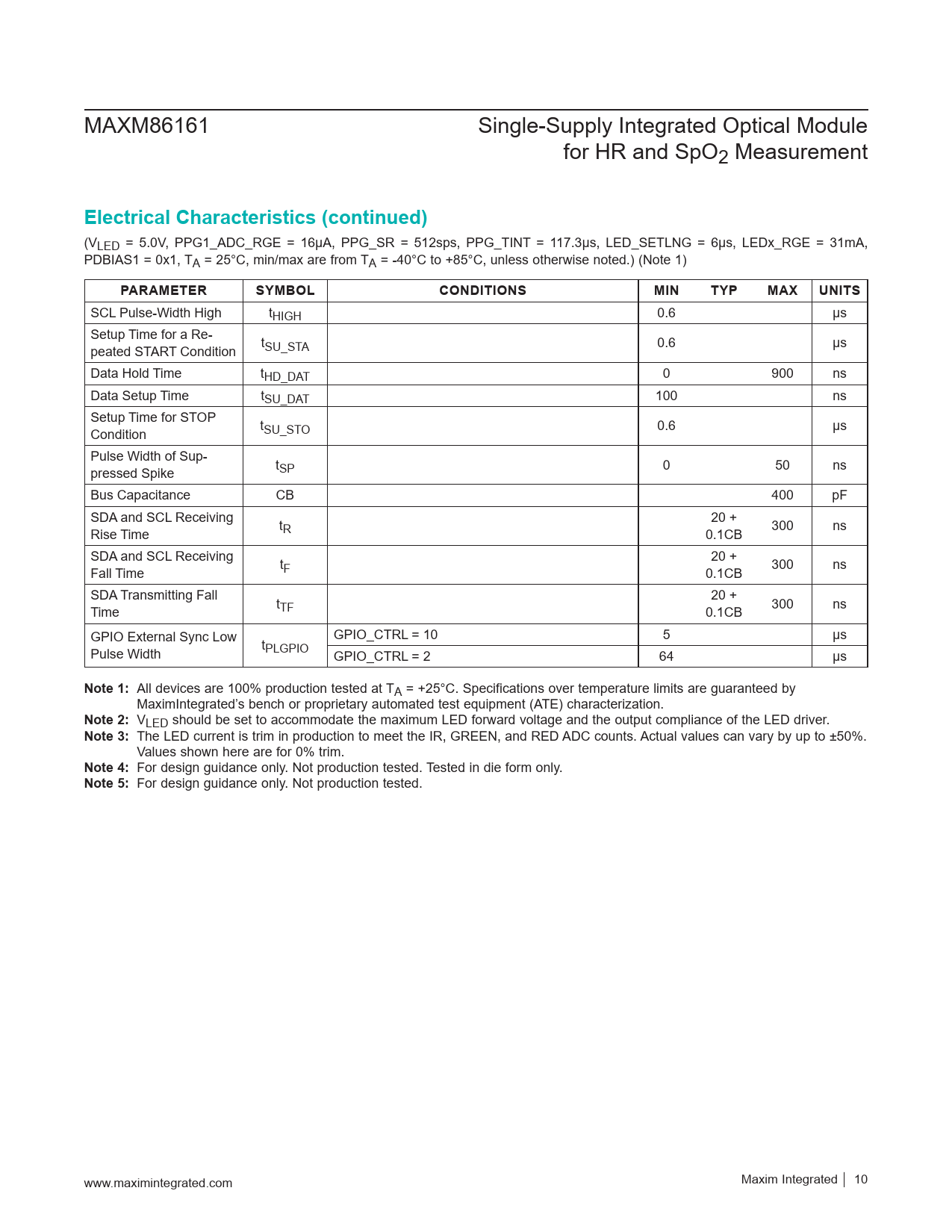 SCL Pulse-Width High tHIGH 0.6 µs Setup Time for a Re- peated START Condition tSU_STA 0.6 µs Data Hold Time tHD_DAT 0 900 ns Data Setup Time tSU_DAT 100 ns Setup Time for STOP Condition tSU_STO 0.6 µs Pulse Width of Sup- pressed Spike tSP 0 50 ns Bus Capacitance CB 400 pF SDA and SCL Receiving 20 + Rise Time tR 0.1CB 300 ns SDA and SCL Receiving 20 + Fall Time tF 0.1CB 300 ns SDA Transmitting Fall 20 + Time tTF 0.1CB 300 ns GPIO External Sync Low GPIO_CTRL = 10 5 μs Pulse Width tPLGPIO GPIO_CTRL = 2 64 μs
