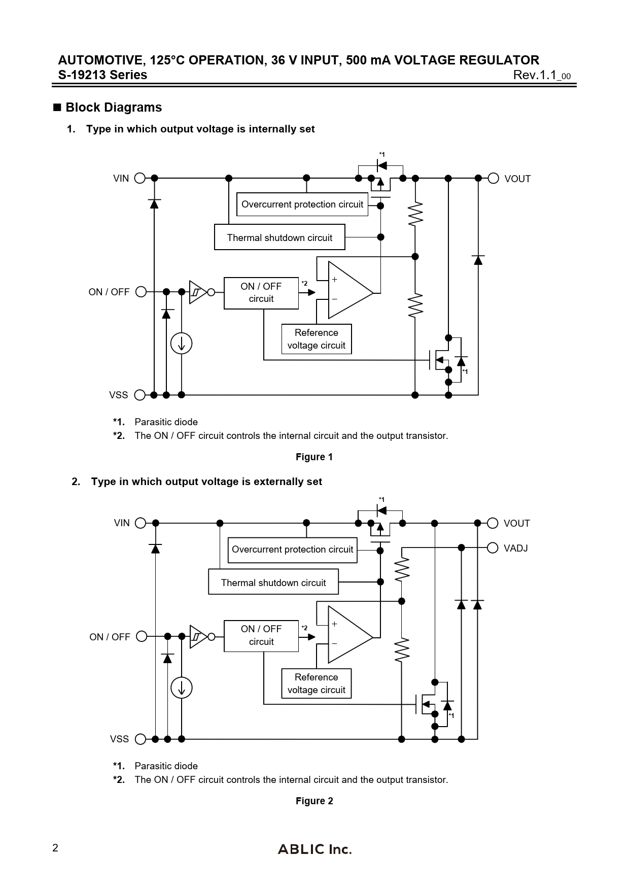 AUTOMOTIVE, 125°C OPERATION, 36 V INPUT, 500 mA VOLTAGE REGULATOR S-19213 Series Rev.1.1_00 Block Diagrams1. Type in which output voltage is internally set*1 VIN VOUT Overcurrent protection circuit Thermal shutdown circuit + ON / OFF *2 ON / OFF circuit − Reference voltage circuit *1 VSS *1. Parasitic diode *2. The ON / OFF circuit controls the internal circuit and the output transistor. Figure 12. Type in which output voltage is externally set*1 VIN VOUT Overcurrent protection circuit VADJ Thermal shutdown circuit ON / OFF + *2 ON / OFF circuit − Reference voltage circuit *1 VSS *1. Parasitic diode *2. The ON / OFF circuit controls the internal circuit and the output transistor. Figure 2 2