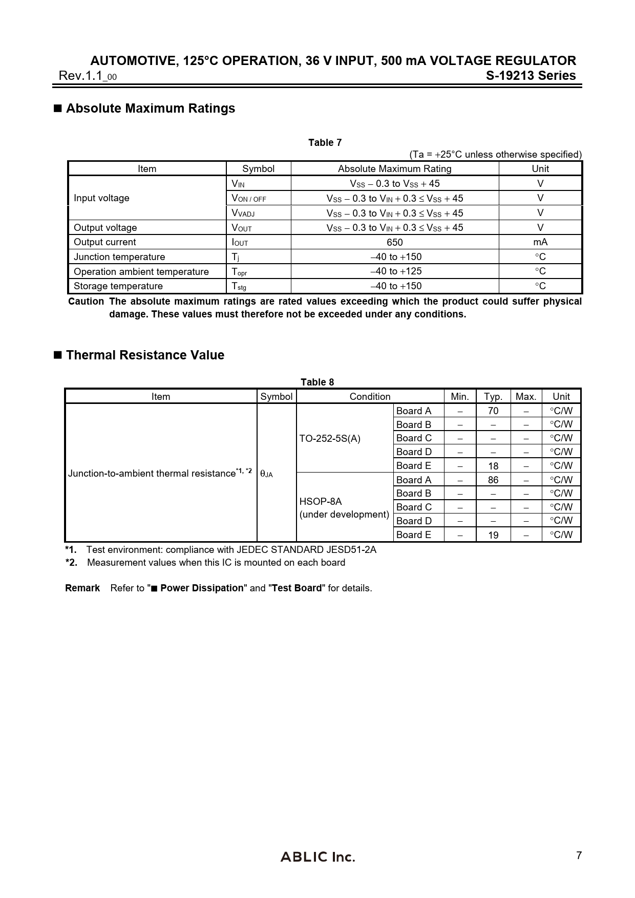 AUTOMOTIVE, 125°C OPERATION, 36 V INPUT, 500 mA VOLTAGE REGULATOR. S-19213 Series. Absolute Maximum Ratings. Table 7