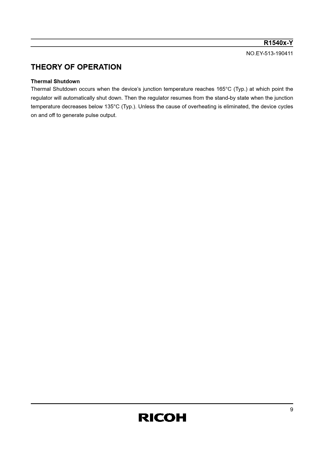 R1540x-Y NO.EY-513-190411 THEORY OF OPERATION Thermal Shutdown Thermal Shutdown occurs when the device’s junction temperature reaches 165°C (Typ.) at which point the regulator will automatically shut down. Then the regulator resumes from the stand-by state when the junction temperature decreases below 135°C (Typ.). Unless the cause of overheating is eliminated, the device cycles on and off to generate pulse output. 9