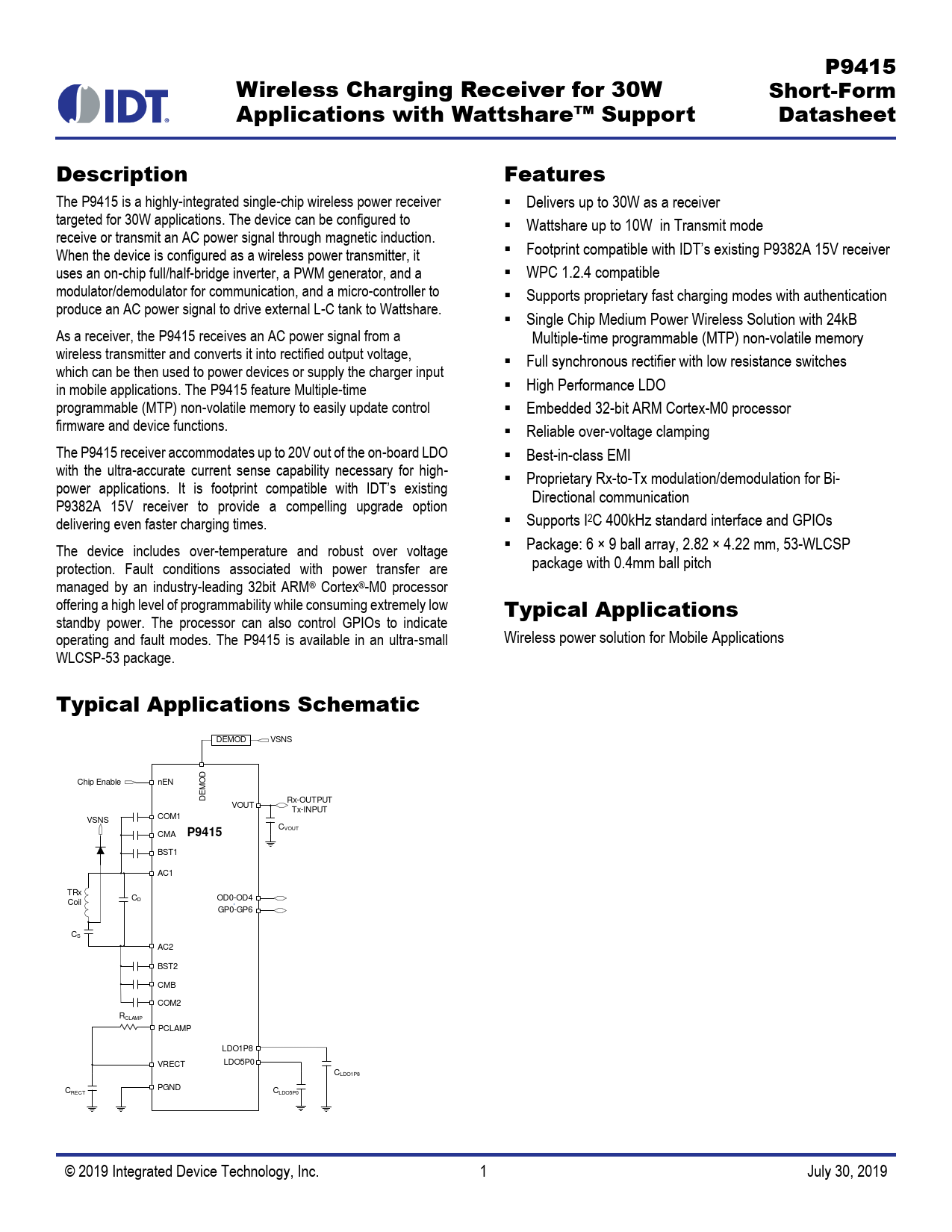 P9415. Wireless Charging Receiver for 30W. Short-Form. Applications with Wattshare™ Support. Datasheet. Description. Features