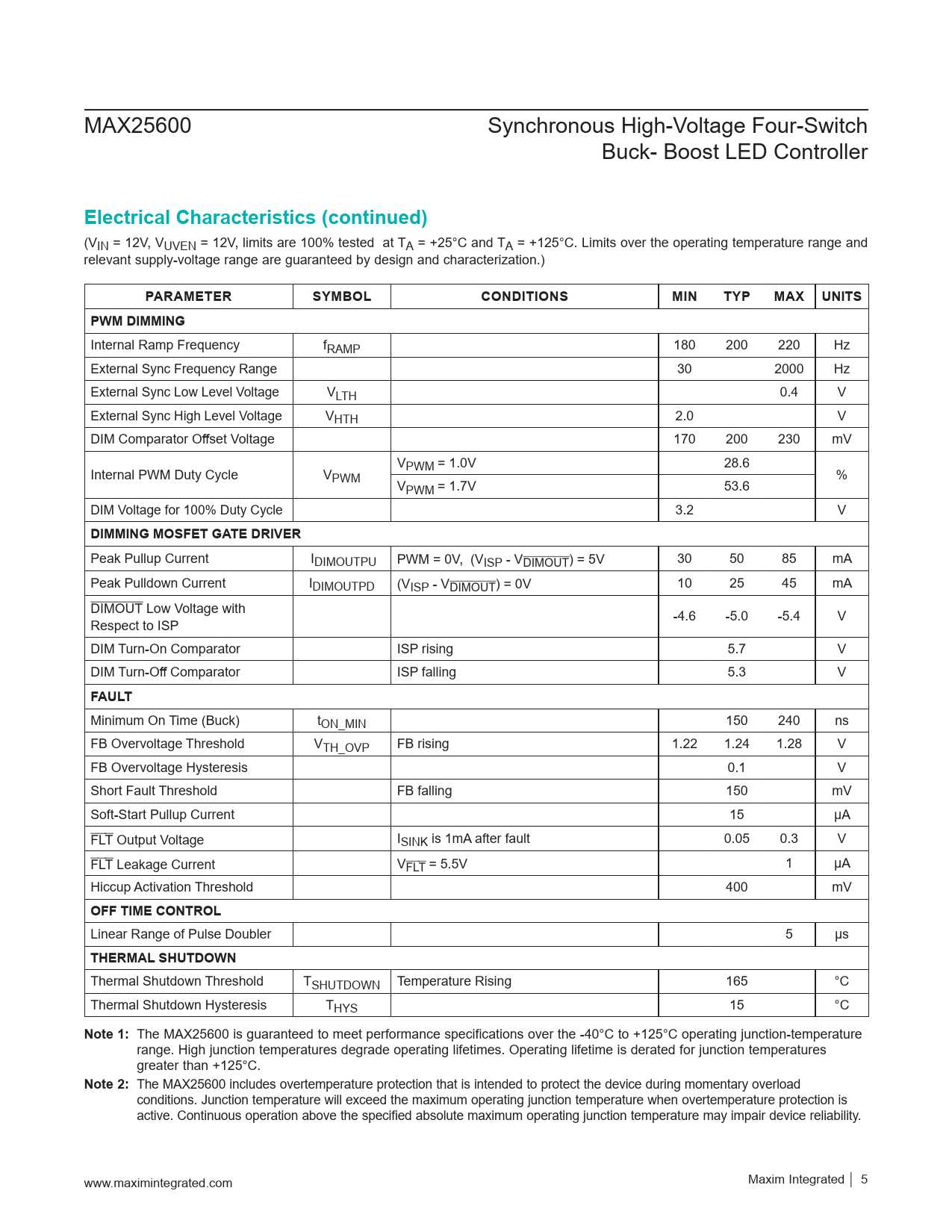 The MAX25600 includes overtemperature protection that is intended to protect the device during momentary overload conditions. Junction temperature will exceed the maximum operating junction temperature when overtemperature protection is active. Continuous operation above the specified absolute maximum operating junction temperature may impair device reliability. www.maximintegrated.com Maxim Integrated │ 5