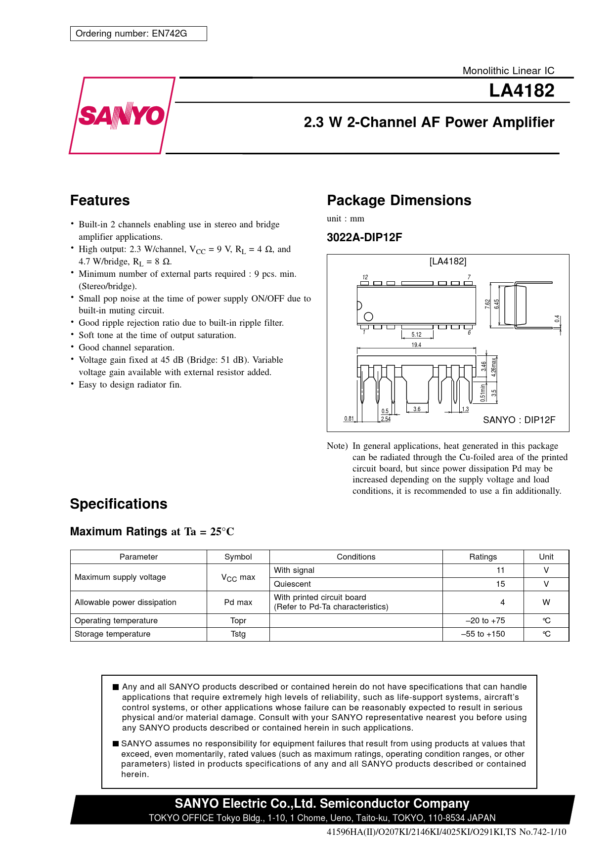 Ordering number: EN742G Monolithic Linear IC LA41822.3 W 2-Channel AF Power AmplifierFeaturesPackage Dimensions . unit : mm Built-in 2 channels enabling use in stereo and bridge amplifier applications. . 3022A-DIP12F High output: 2.3 W/channel, VCC = 9 V, RL = 4 Ω, and 4.7 W/bridge, RL = 8 Ω. [LA4182] Minimum number of external parts required : 9 pcs. min. 12 7 (Stereo/bridge). Small pop noise at the time of power supply ON/OFF due to built-in muting circuit. 7.62 6.45 . Good ripple rejection ratio due to built-in ripple filter. 0.4 . Soft tone at the time of output saturation. 1 6 . 5.12 Good channel separation. 19.4 . Voltage gain fixed at 45 dB (Bridge: 51 dB). Variable voltage gain available with external resistor added. 3.46 . 4.26max Easy to design radiator fin. 3.5 0.51min 3.6 1.3 0.5 0.81 2.54 SANYO : DIP12F Note) In general applications, heat generated in this package can be radiated through the Cu-foiled area of the printed circuit board, but since power dissipation Pd may be increased depending on the supply voltage and load conditions, it is recommended to use a fin additionally. SpecificationsMaximum Ratings at Ta = 25°C Parameter Symbol Conditions Ratings Unit With signal 11 V Maximum supply voltage VCC max Quiescent 15 V With printed circuit board Allowable power dissipation Pd max 4 W (Refer to Pd-Ta characteristics) Operating temperature Topr –20 to +75 °C Storage temperature Tstg –55 to +150 °C Any and all SANYO products described or contained herein do not have specifications that can handle applications that require extremely high levels of reliability, such as life-support systems, aircraft’s control systems, or other applications whose failure can be reasonably expected to result in serious physical and/or material damage. Consult with your SANYO representative nearest you before using any SANYO products described or contained herein in such applications. SANYO assumes no responsibility for equipment failures that result from using products at values that exceed, even momentarily, rated values (such as maximum ratings, operating condition ranges, or other parameters) listed in products specifications of any and all SANYO products described or contained herein. SANYO Electric Co.,Ltd. Semiconductor Company TOKYO OFFICE Tokyo Bldg., 1-10, 1 Chome, Ueno, Taito-ku, TOKYO, 110-8534 JAPAN 41596HA(II)/O207KI/2146KI/4025KI/O291KI,TS No.742-1/10