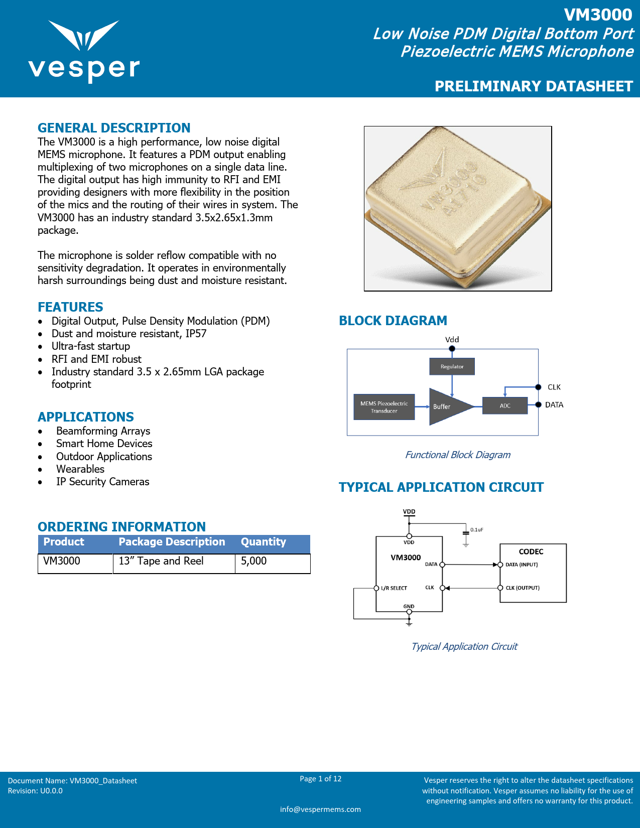 The VM3000 is a high performance, low noise digital MEMS microphone. It features a PDM output enabling multiplexing of two microphones on a single data line. The digital output has high immunity to RFI and EMI providing designers with more flexibility in the position of the mics and the routing of their wires in system. The VM3000 has an industry standard 3.5x2.65x1.3mm package. The microphone is solder reflow compatible with no sensitivity degradation. It operates in environmentally harsh surroundings being dust and moisture resistant.