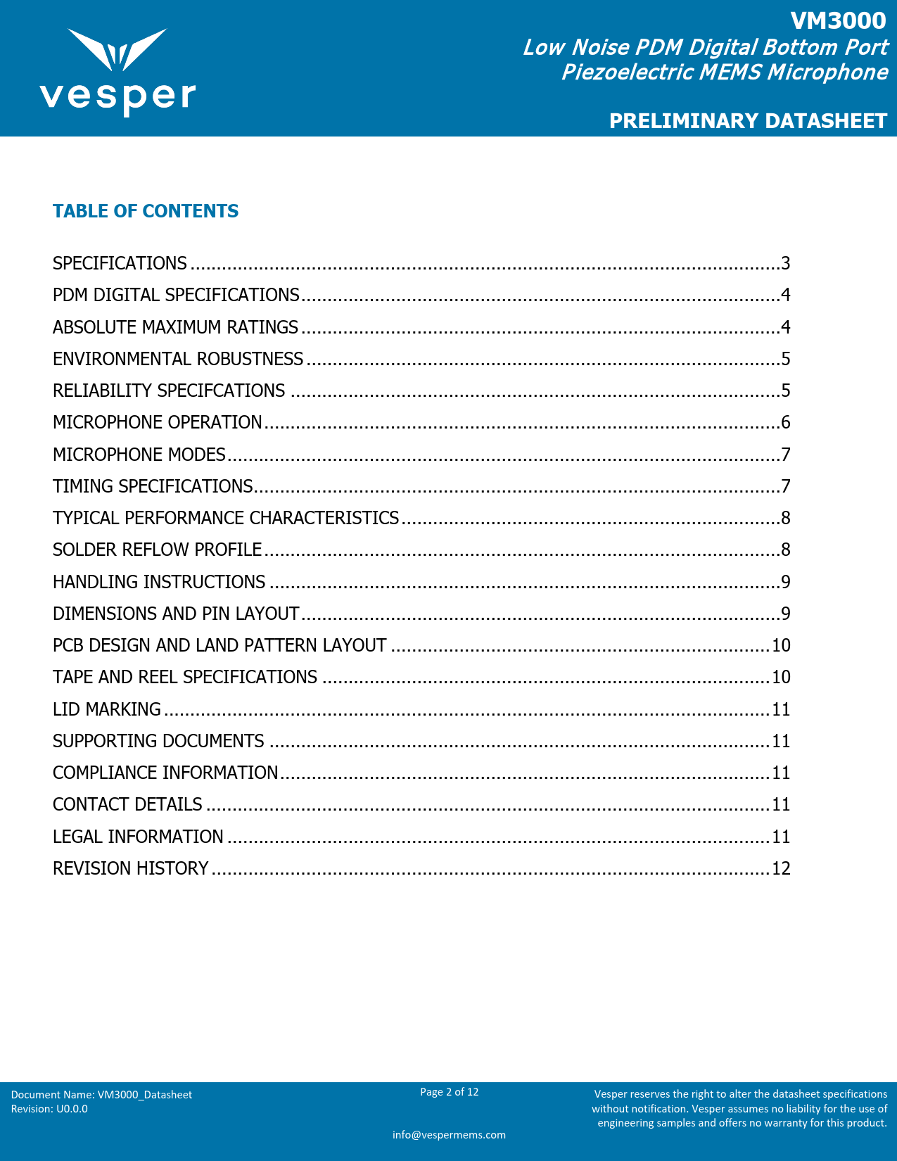 SPECIFICATIONS .. 3 PDM DIGITAL SPECIFICATIONS ... 4 ABSOLUTE MAXIMUM RATINGS ... 4 ENVIRONMENTAL ROBUSTNESS .. 5 RELIABILITY SPECIFCATIONS ... 5 MICROPHONE OPERATION .. 6 MICROPHONE MODES ... 7 TIMING SPECIFICATIONS .. 7 TYPICAL PERFORMANCE CHARACTERISTICS .. 8 SOLDER REFLOW PROFILE .. 8 HANDLING INSTRUCTIONS ... 9 DIMENSIONS AND PIN LAYOUT ... 9 PCB DESIGN AND LAND PATTERN LAYOUT .. 10 TAPE AND REEL SPECIFICATIONS ... 10 LID MARKING ... 11 SUPPORTING DOCUMENTS ... 11 COMPLIANCE INFORMATION ... 11 CONTACT DETAILS ... 11 LEGAL INFORMATION ... 11 REVISION HISTORY .. 12 Document Name: VM3000_Datasheet Page 2 of 12 Vesper reserves the right to alter the datasheet specifications Revision: U0.0.0 without notification. Vesper assumes no liability for the use of engineering samples and offers no warranty for this product. info@vespermems.com Document Outline GENERAL DESCRIPTION FEATURES APPLICATIONS ORDERING INFORMATION BLOCK DIAGRAM TYPICAL APPLICATION CIRCUIT TABLE OF CONTENTS SPECIFICATIONS PDM DIGITAL SPECIFICATIONS ABSOLUTE MAXIMUM RATINGS ENVIRONMENTAL ROBUSTNESS RELIABILITY SPECIFCATIONS MICROPHONE OPERATION MICROPHONE MODES TIMING SPECIFICATIONS TYPICAL PERFORMANCE CHARACTERISTICS SOLDER REFLOW PROFILE HANDLING INSTRUCTIONS DIMENSIONS AND PIN LAYOUT PCB DESIGN AND LAND PATTERN LAYOUT TAPE AND REEL SPECIFICATIONS LID MARKING SUPPORTING DOCUMENTS COMPLIANCE INFORMATION CONTACT DETAILS LEGAL INFORMATION REVISION HISTORY