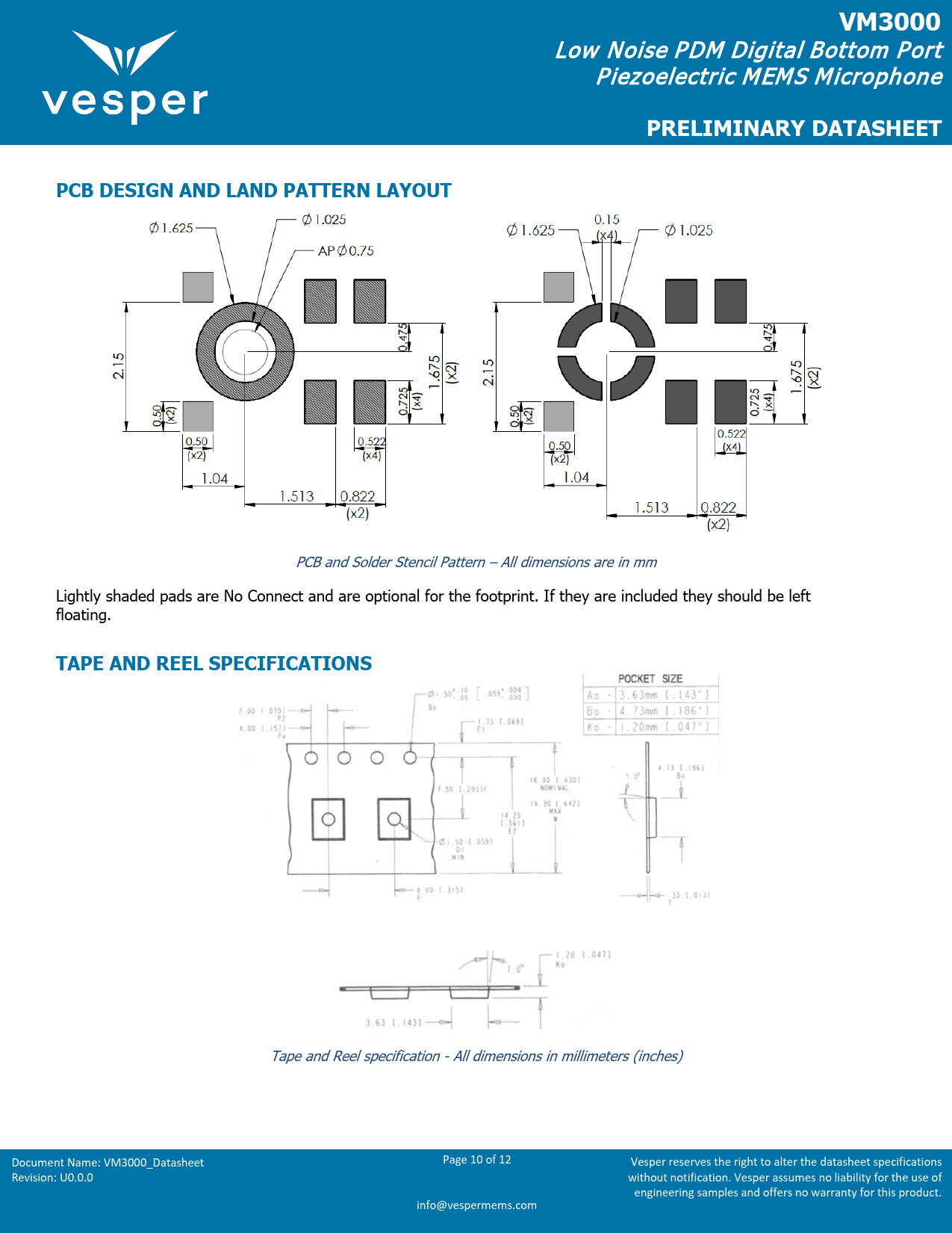 Tape and Reel specification - All dimensions in millimeters (inches) Document Name: VM3000_Datasheet Page 10 of 12 Vesper reserves the right to alter the datasheet specifications Revision: U0.0.0 without notification. Vesper assumes no liability for the use of engineering samples and offers no warranty for this product. info@vespermems.com Document Outline GENERAL DESCRIPTION FEATURES APPLICATIONS ORDERING INFORMATION BLOCK DIAGRAM TYPICAL APPLICATION CIRCUIT TABLE OF CONTENTS SPECIFICATIONS PDM DIGITAL SPECIFICATIONS ABSOLUTE MAXIMUM RATINGS ENVIRONMENTAL ROBUSTNESS RELIABILITY SPECIFCATIONS MICROPHONE OPERATION MICROPHONE MODES TIMING SPECIFICATIONS TYPICAL PERFORMANCE CHARACTERISTICS SOLDER REFLOW PROFILE HANDLING INSTRUCTIONS DIMENSIONS AND PIN LAYOUT PCB DESIGN AND LAND PATTERN LAYOUT TAPE AND REEL SPECIFICATIONS LID MARKING SUPPORTING DOCUMENTS COMPLIANCE INFORMATION CONTACT DETAILS LEGAL INFORMATION REVISION HISTORY