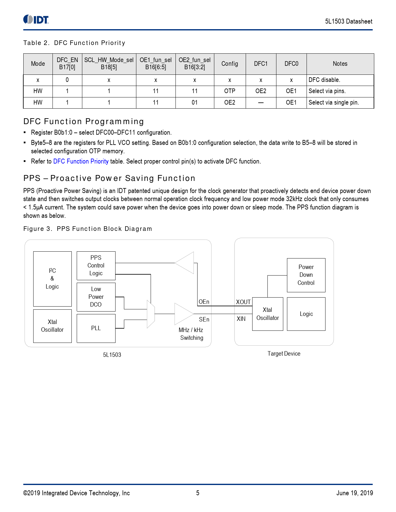 PPS Control Power I2C Logic Down & Control Logic Low Power DCO OEn XOUT Xtal Logic XIN Oscil ator Xtal SEn Oscil ator PLL MHz / kHz Switching 5L1503 Target Device ©2019 Integrated Device Technology, Inc 5 June 19, 2019 Document Outline Description Typical Applications Features Output Features Key Specifications Block Diagram Pin Assignments Figure 1. Pin Assignments for 2.0 × 2.0 mm 10-VFQFPN Package Pin Descriptions Table 1. Pin Descriptions Device Feature and Function DFC – Dynamic Frequency Control Figure 2. DFC Function Block Diagram Table 2. DFC Function Priority DFC Function Programming PPS – Proactive Power Saving Function Figure 3. PPS Function Block Diagram Figure 4. PPS Assertion/Deassertion Timing Chart PPS Function Programming Output Divider Selection Table 3. Output Divider Selection Device Output Support 5L1503 5L1503L 5L1503S OE Pin Function Table 4. OE Pin Function Table 5. OE Pin Function Summary Table 6. PD# Priority Spread Spectrum Spread Spectrum Digital Spread Spectrum Figure 5. Digital Spread Spectrum Reference Input and Selection Crystal Input (X1/X2) Table 7. Programmable Tuning Capacitors Figure 6. Crystal Oscillator Reference Circuit Absolute Maximum Ratings Table 8. Absolute Maximum Ratings Thermal Characteristics Table 9. Thermal Characteristics Recommended Operating Conditions Table 10. Recommended Operating Conditions Crystal Characteristics Table 11. Crystal Characteristics DC Electrical Characteristics Table 12. DC Electrical Characteristics – Current Table 13. DC Electrical Characteristics – Input and Output Voltage AC Electrical Characteristics Table 14. AC Timing Electrical Characteristics I2C Bus DC Characteristics Table 15. I2C Bus DC Characteristics Table 16. I2C Bus AC Characteristics Spread Spectrum Generation Specifications Table 17. Spread Spectrum Generation Specifications (5L1503S only) General I2C Interface Information How to Write How to Read Glossary of Features Table 18. Glossary of Features Package Outline Drawings Ordering Information Marking Diagrams Revision History