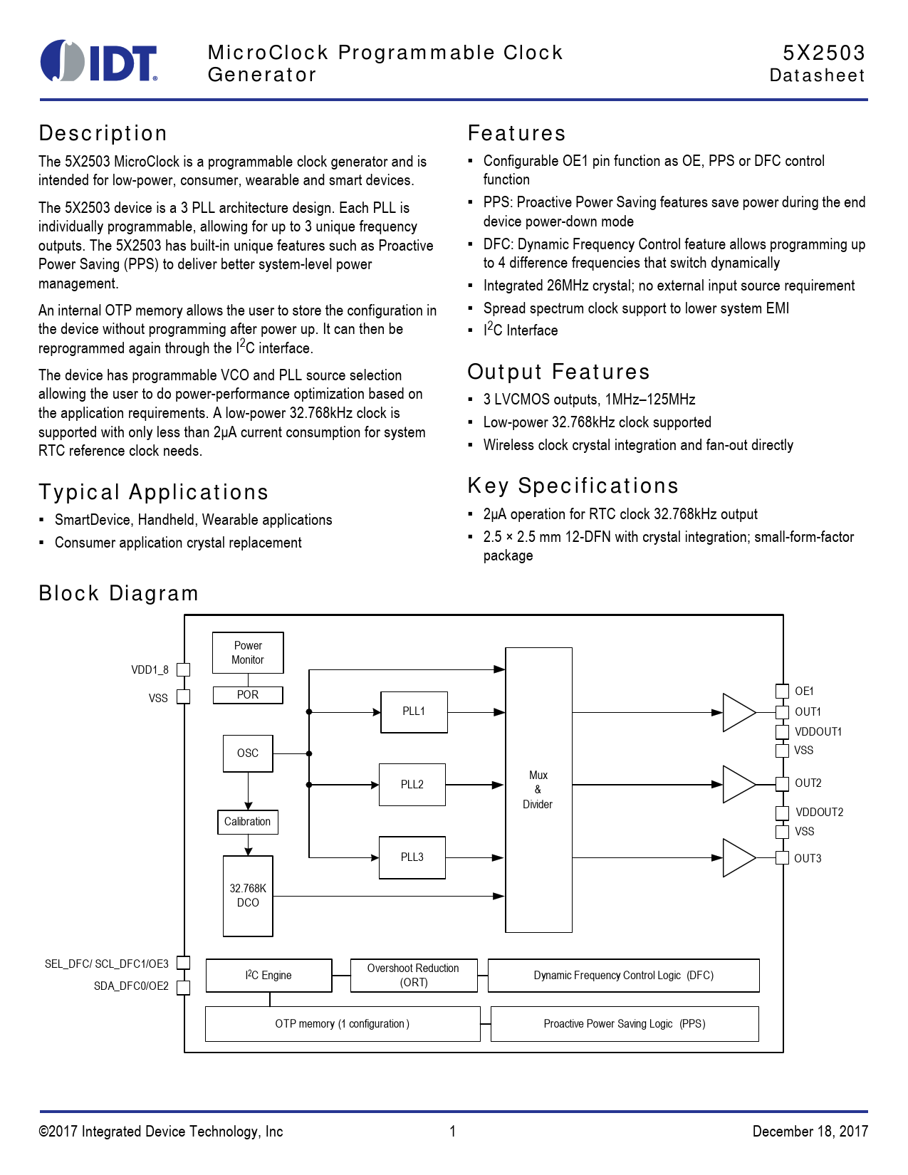 MicroClock Programmable Clock. 5X2503. Generator. Datasheet. Description. Features. Output Features. Typical Applications