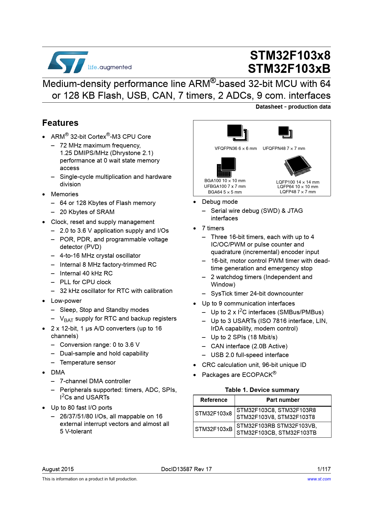 STM32F103x8. STM32F103xB. Datasheet. production data. Features. Table 1. Device summary. Reference. Part number
