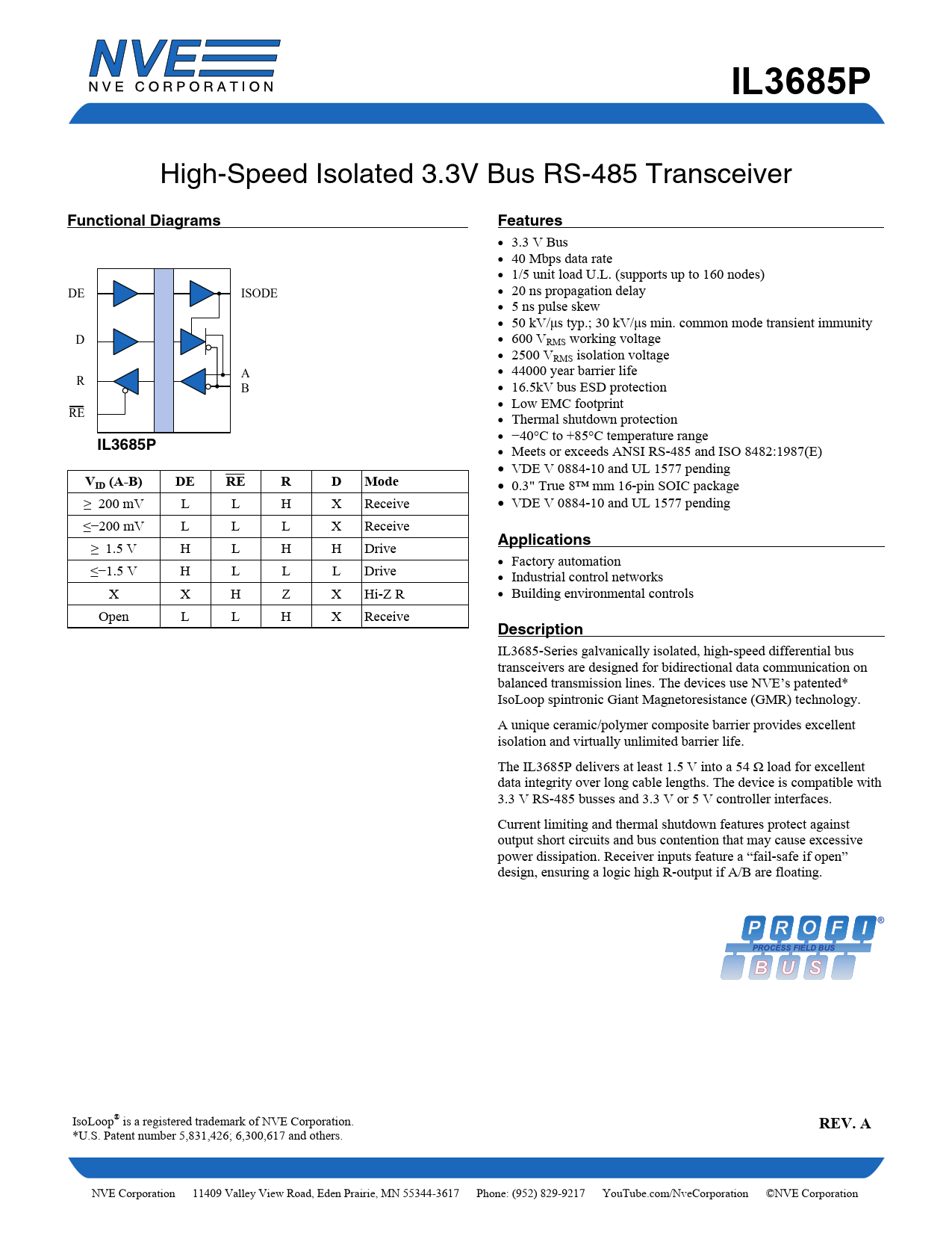 IL3685-Series galvanically isolated, high-speed differential bus transceivers are designed for bidirectional data communication on balanced transmission lines. The devices use NVE’s patented* IsoLoop spintronic Giant Magnetoresistance (GMR) technology. A unique ceramic/polymer composite barrier provides excellent isolation and virtually unlimited barrier life. The IL3685P delivers at least 1.5 V into a 54 Ω load for excellent data integrity over long cable lengths. The device is compatible with 3.3 V RS-485 busses and 3.3 V or 5 V controller interfaces. Current limiting and thermal shutdown features protect against output short circuits and bus contention that may cause excessive power dissipation. Receiver inputs feature a “fail-safe if open” design, ensuring a logic high R-output if A/B are floating. IsoLoop® is a registered trademark of NVE Corporation.