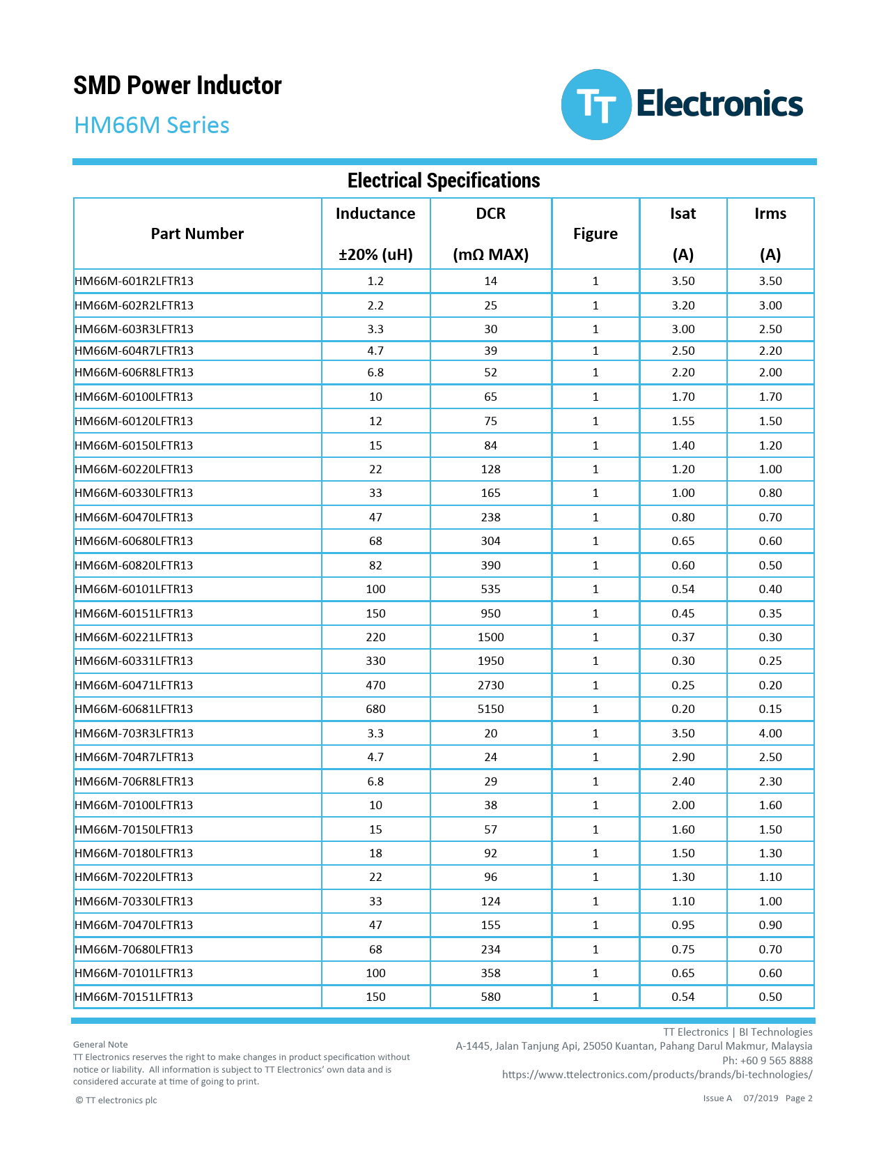 HM66M-601R2LFTR13 1.2 14 1 3.50 3.50 HM66M-602R2LFTR13 2.2 25 1 3.20 3.00 HM66M-603R3LFTR13 3.3 30 1 3.00 2.50 HM66M-604R7LFTR13 4.7 39 1 2.50 2.20 HM66M-606R8LFTR13 6.8 52 1 2.20 2.00 HM66M-60100LFTR13 10 65 1 1.70 1.70 HM66M-60120LFTR13 12 75 1 1.55 1.50 HM66M-60150LFTR13 15 84 1 1.40 1.20 HM66M-60220LFTR13 22 128 1 1.20 1.00 HM66M-60330LFTR13 33 165 1 1.00 0.80 HM66M-60470LFTR13 47 238 1 0.80 0.70 HM66M-60680LFTR13 68 304 1 0.65 0.60 HM66M-60820LFTR13 82 390 1 0.60 0.50 HM66M-60101LFTR13 100 535 1 0.54 0.40 HM66M-60151LFTR13 150 950 1 0.45 0.35 HM66M-60221LFTR13 220 1500 1 0.37 0.30 HM66M-60331LFTR13 330 1950 1 0.30 0.25 HM66M-60471LFTR13 470 2730 1 0.25 0.20 HM66M-60681LFTR13 680 5150 1 0.20 0.15 HM66M-703R3LFTR13 3.3 20 1 3.50 4.00 HM66M-704R7LFTR13 4.7 24 1 2.90 2.50 HM66M-706R8LFTR13 6.8 29 1 2.40 2.30 HM66M-70100LFTR13 10 38 1 2.00 1.60 HM66M-70150LFTR13 15 57 1 1.60 1.50 HM66M-70180LFTR13 18 92 1 1.50 1.30 HM66M-70220LFTR13 22 96 1 1.30 1.10 HM66M-70330LFTR13 33 124 1 1.10 1.00 HM66M-70470LFTR13 47 155 1 0.95 0.90 HM66M-70680LFTR13 68 234 1 0.75 0.70 HM66M-70101LFTR13 100 358 1 0.65 0.60 HM66M-70151LFTR13 150 580 1 0.54 0.50 TT Electronics | BI Technologies General Note A-1445, Jalan Tanjung Api, 25050 Kuantan, Pahang Darul Makmur, Malaysia TT Electronics reserves the right to make changes in product specification without Ph: +60 9 565 8888 notice or liability. All information is subject to TT Electronics’ own data and is https://www.ttelectronics.com/products/brands/bi-technologies/ considered accurate at time of going to print. © TT electronics plc Issue A 07/2019 Page 2