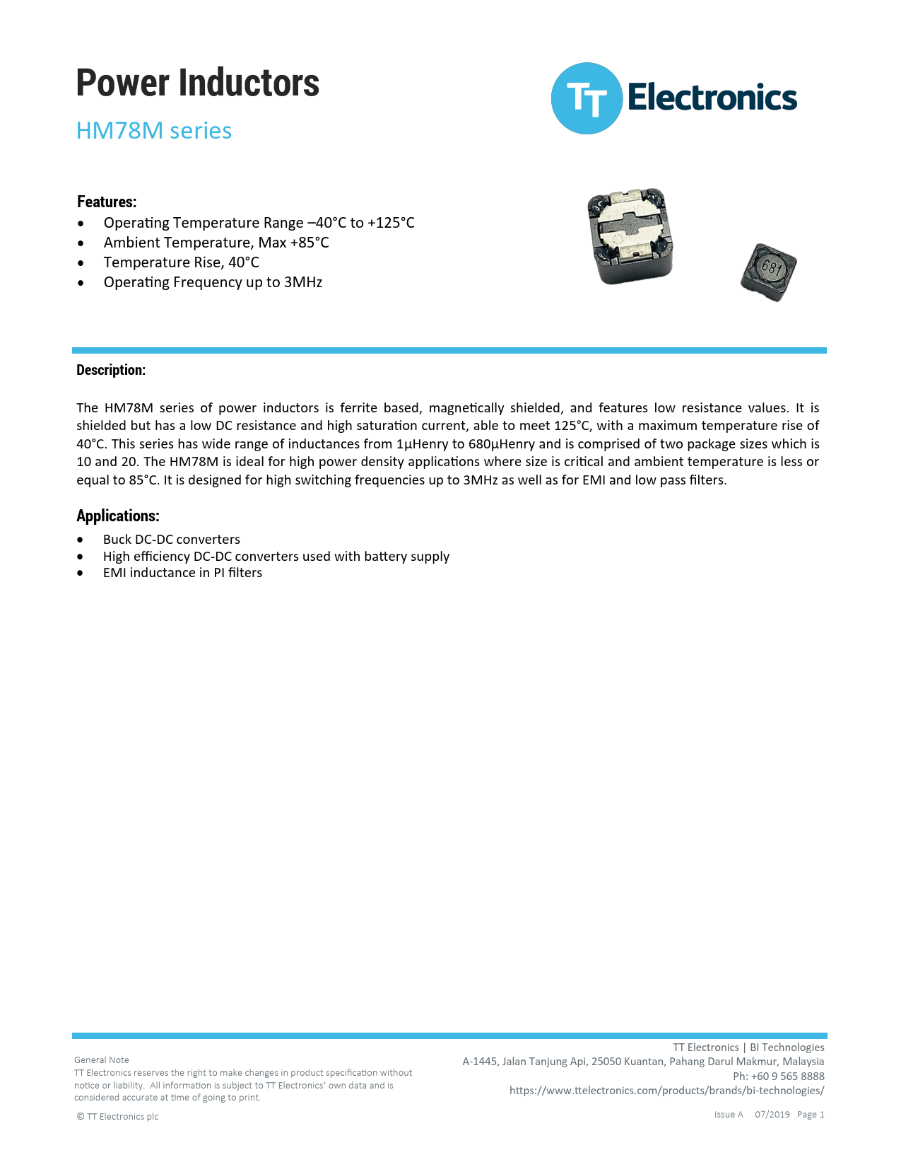 • Buck DC-DC converters • High efficiency DC-DC converters used with battery supply • EMI inductance in PI filters TT Electronics | BI Technologies General Note A-1445, Jalan Tanjung Api, 25050 Kuantan, Pahang Darul Makmur, Malaysia TT Electronics reserves the right to make changes in product specification without Ph: +60 9 565 8888 notice or liability. All information is subject to TT Electronics’ own data and is https://www.ttelectronics.com/products/brands/bi-technologies/ considered accurate at time of going to print. © TT Electronics plc Issue A 07/2019 Page 1