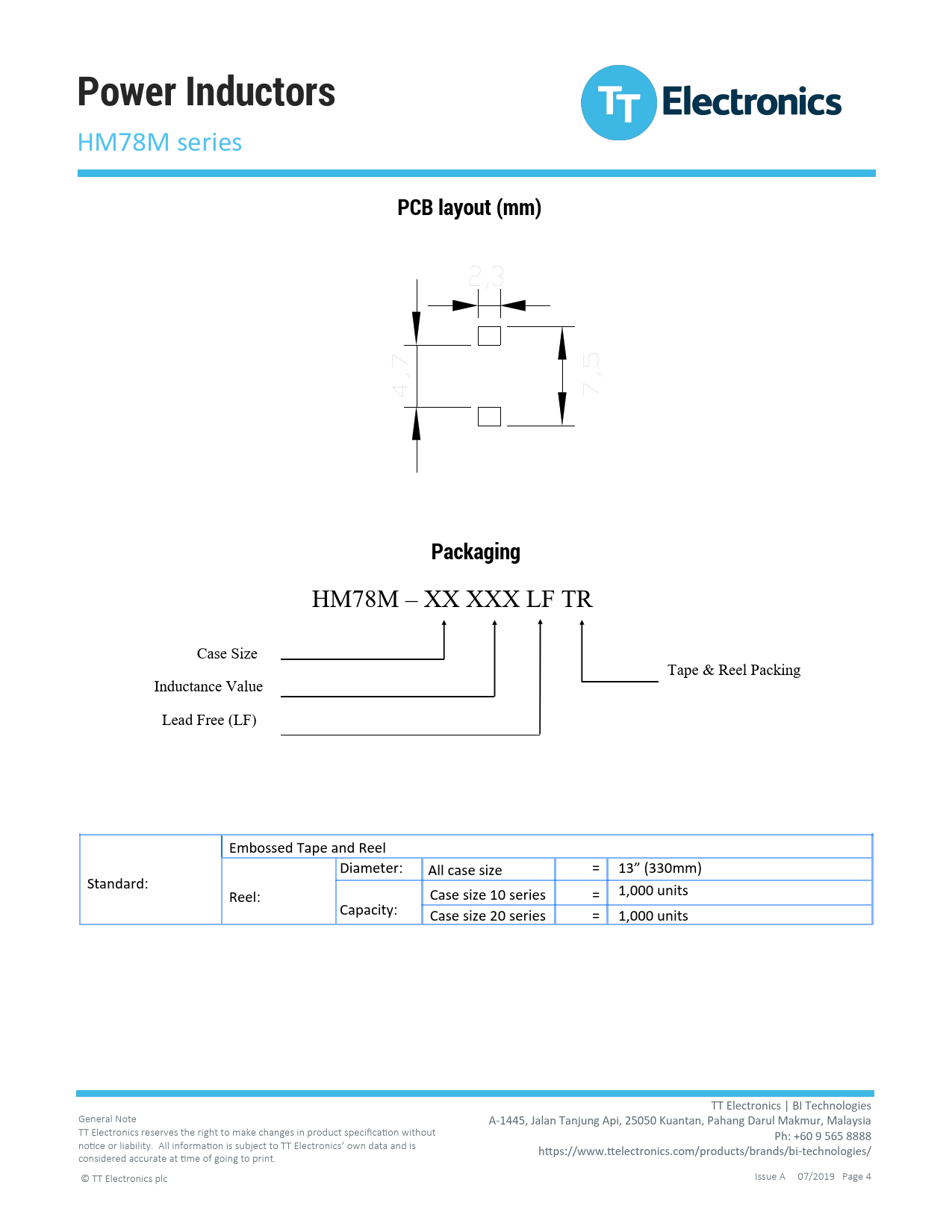 HM78M – XX XXX LF TR Case Size Tape & Reel Packing Inductance Value Lead Free (LF) Embossed Tape and Reel Diameter: All case size = 13” (330mm) Standard: Reel: Case size 10 series = 1,000 units Capacity: Case size 20 series = 1,000 units TT Electronics | BI Technologies General Note A-1445, Jalan Tanjung Api, 25050 Kuantan, Pahang Darul Makmur, Malaysia TT Electronics reserves the right to make changes in product specification without Ph: +60 9 565 8888 notice or liability. All information is subject to TT Electronics’ own data and is https://www.ttelectronics.com/products/brands/bi-technologies/ considered accurate at time of going to print. © TT Electronics plc Issue A 07/2019 Page 4