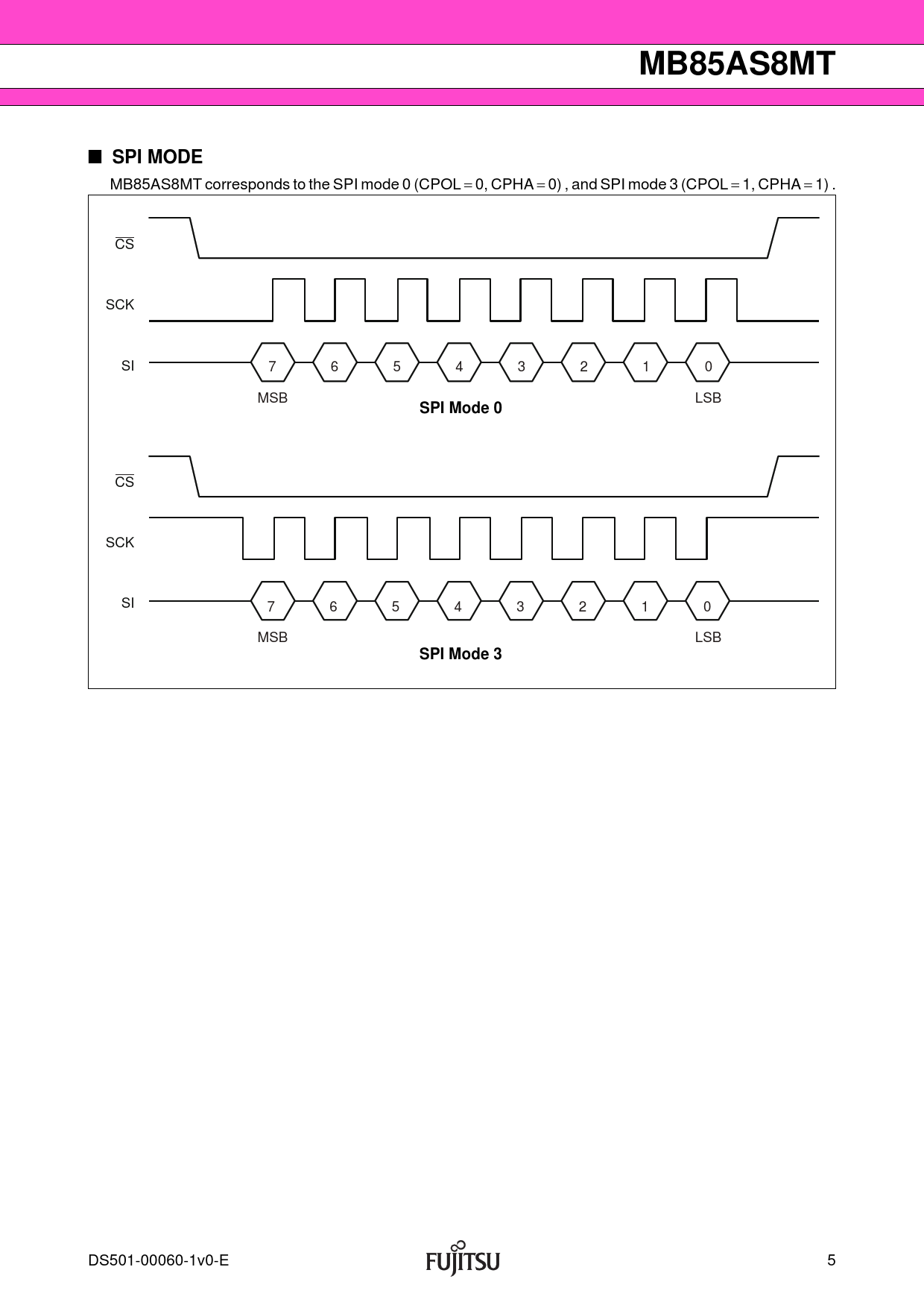MB85AS8MT corresponds to the SPI mode 0 (CPOL 0, CPHA 0) , and SPI mode 3 (CPOL 1, CPHA 1) . CS SCK SI 7 6 5 4 3 2 1 0 MSB LSB