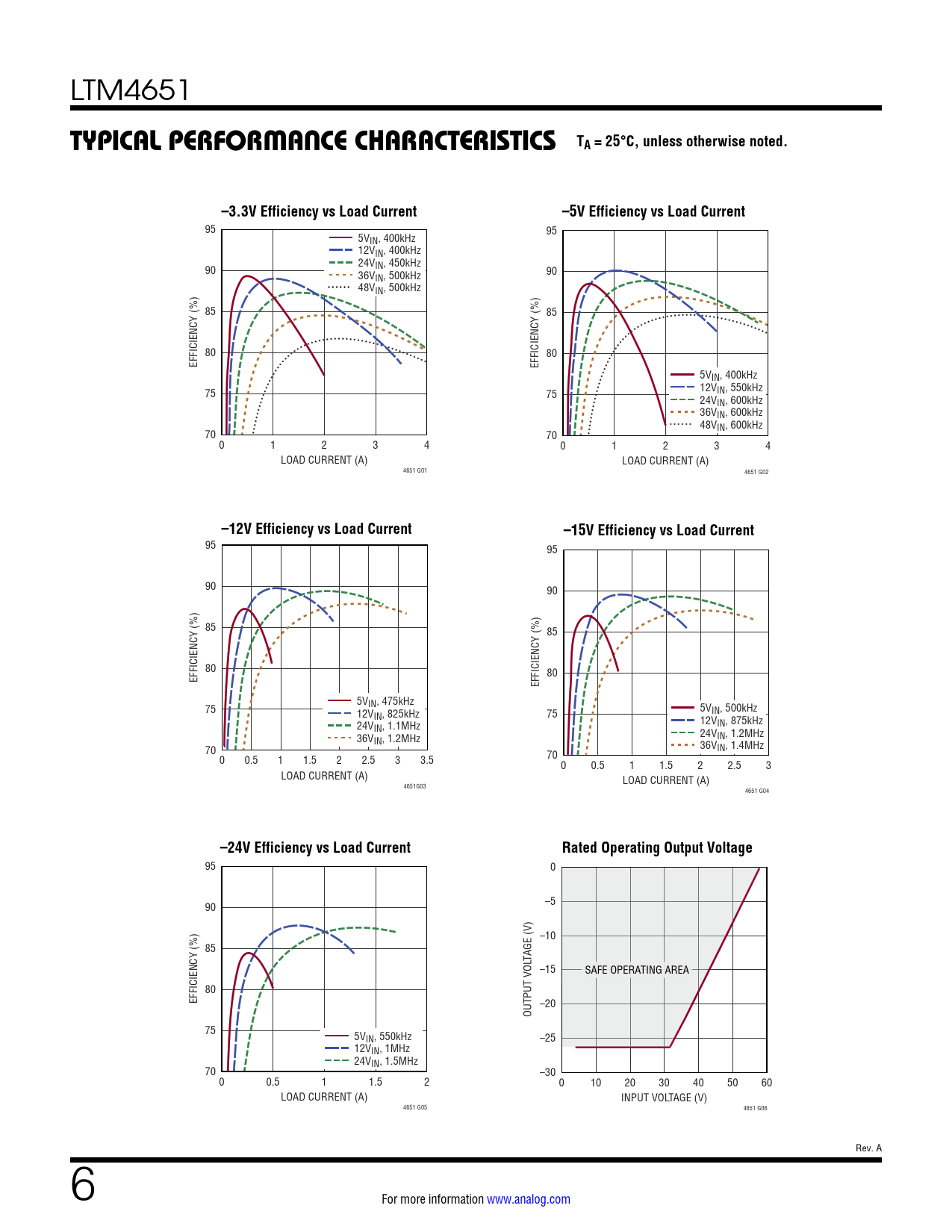 95 0 90 –5 –10 85 TAGE (V) –15 SAFE OPERATING AREA 80 EFFICIENCY (%) –20 OUTPUT VOL 75 5VIN, 550kHz –25 12VIN, 1MHz 24VIN, 1.5MHz 70 –30 0 0.5 1 1.5 2 0 10 20 30 40 50 60 LOAD CURRENT (A) INPUT VOLTAGE (V) 4651 G05 4651 G06 Rev. A 6 For more information www.analog.com Document Outline Features Applications Typical Application Description Absolute Maximum Ratings Order Information Pin Configuration Electrical Characteristics Typical Performance Characteristics Pin Functions Simplified Block Diagram Test Circuit Decoupling Requirements Operation Applications Information Typical Applications Package Photograph Package Description Typical Application Related Parts