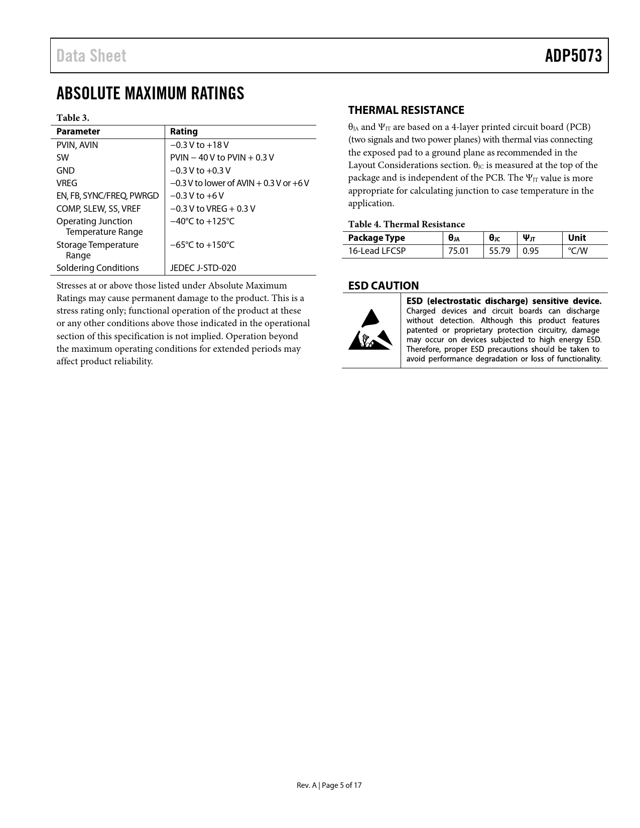 Data Sheet ADP5073 ABSOLUTE MAXIMUM RATINGS THERMAL RESISTANCE Table 3 Parameter Rating Table 4 Thermal Resistance