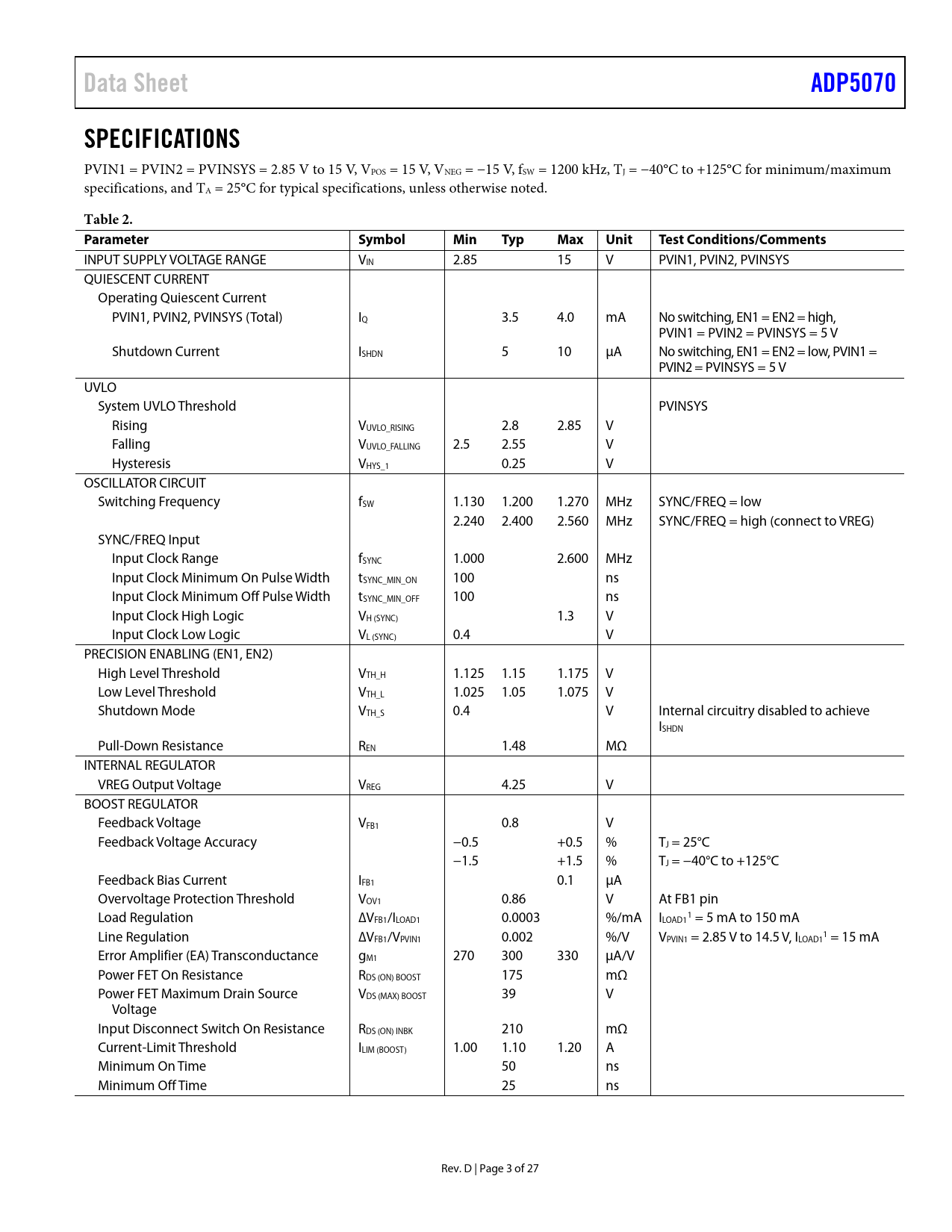 Data Sheet. ADP5070. SPECIFICATIONS. Table 2. Parameter. Symbol. Min. Typ. Max. Unit. Test Conditions/Comments