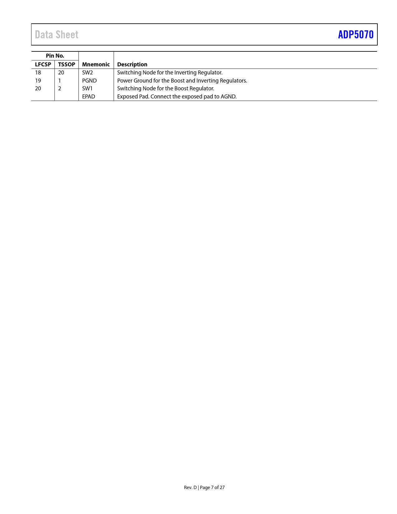 | Páginas / Página | 27 / 7 — Data Sheet. ADP5070. Pin No. LFCSP TSSOP Mnemonic Description |