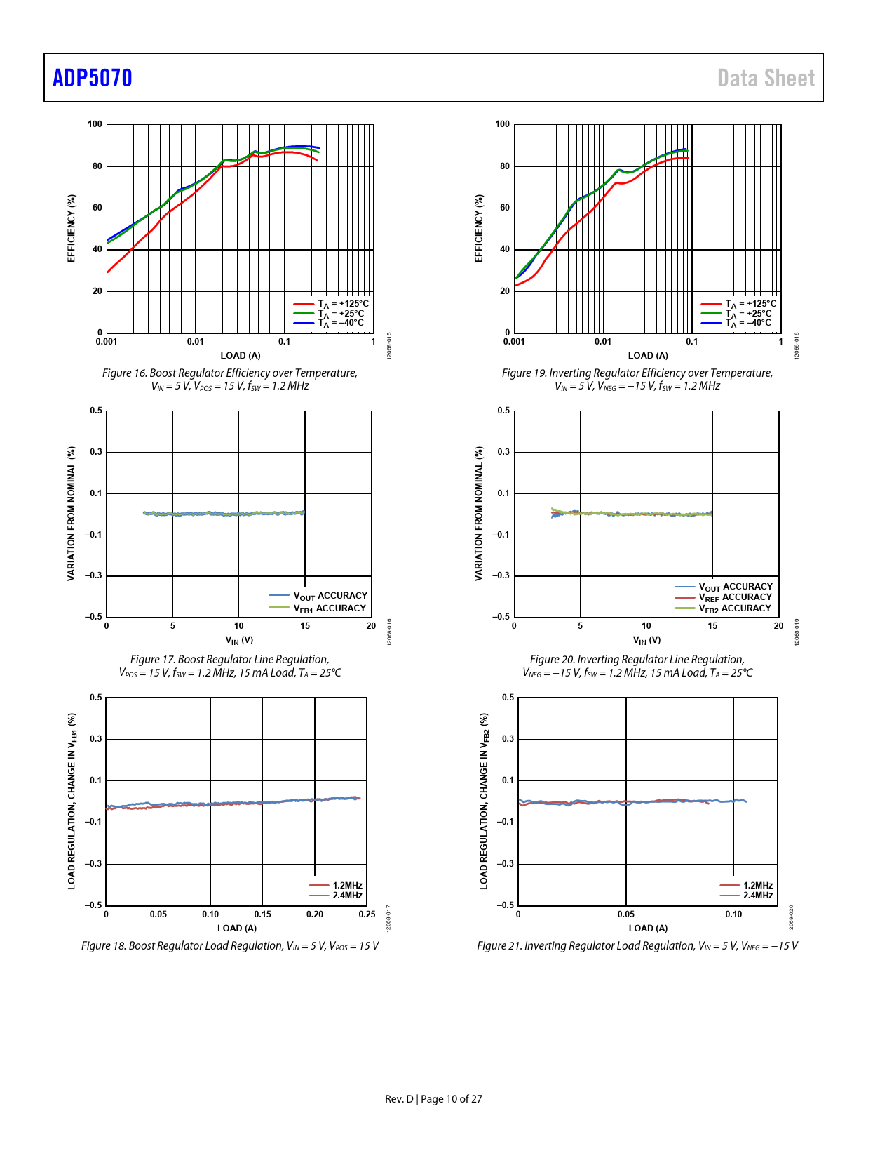 12068- Figure 17. Boost Regulator Line Regulation, Figure 20. Inverting Regulator Line Regulation, VPOS = 15 V, fSW = 1.2 MHz, 15 mA Load, TA = 25°C VNEG = −15 V, fSW = 1.2 MHz, 15 mA Load, TA = 25°C