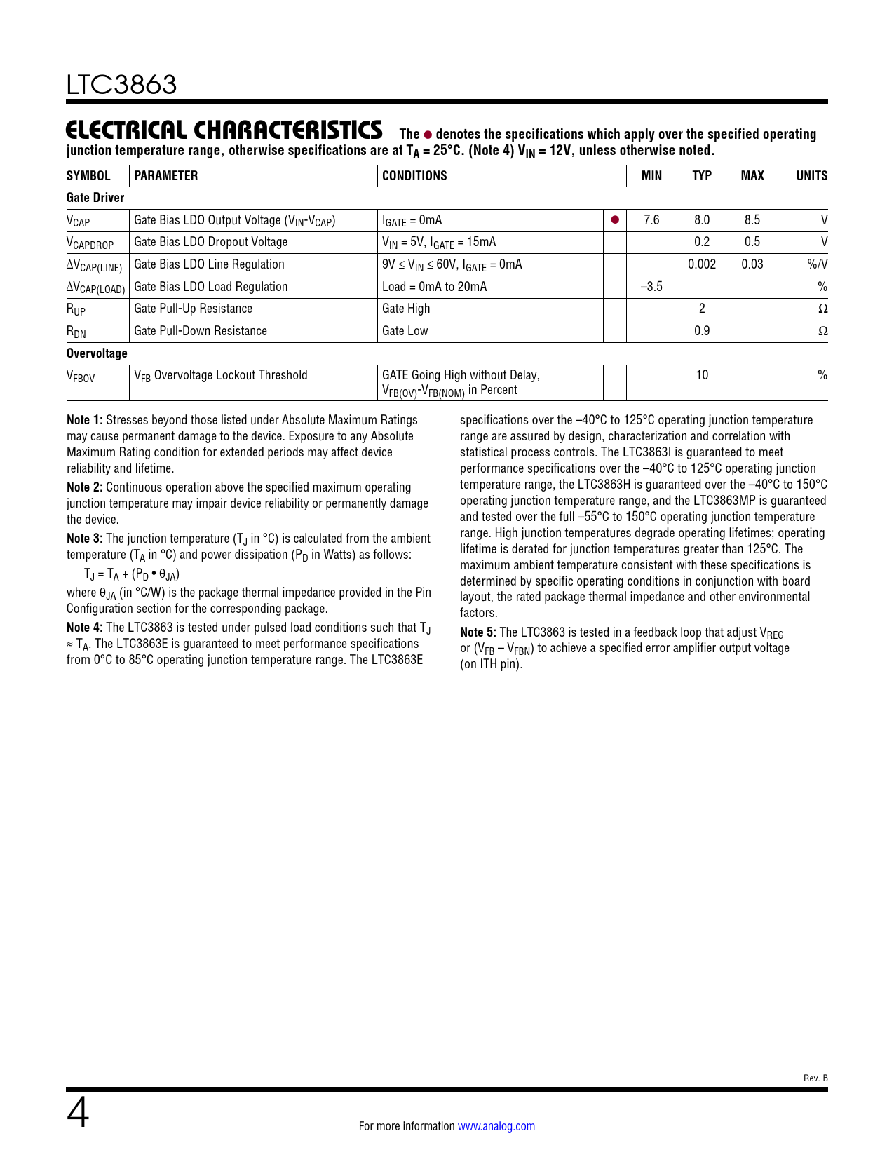 LTC3863 ELECTRICALCHARACTERISTICS The l denotes the specifications which apply over the specified operatingjunction temperature range, otherwise specifications are at TA = 25°C. (Note 4) VIN = 12V, unless otherwise noted. SYMBOLPARAMETERCONDITIONSMINTYPMAXUNITSGate Driver VCAP Gate Bias LDO Output Voltage (VIN-VCAP) IGATE = 0mA l 7.6 8.0 8.5 V VCAPDROP Gate Bias LDO Dropout Voltage VIN = 5V, IGATE = 15mA 0.2 0.5 V ∆VCAP(LINE) Gate Bias LDO Line Regulation 9V ≤ VIN ≤ 60V, IGATE = 0mA 0.002 0.03 %/V ∆VCAP(LOAD) Gate Bias LDO Load Regulation Load = 0mA to 20mA –3.5 % RUP Gate Pull-Up Resistance Gate High 2 Ω RDN Gate Pull-Down Resistance Gate Low 0.9 Ω Overvoltage VFBOV VFB Overvoltage Lockout Threshold GATE Going High without Delay, 10 % VFB(OV)-VFB(NOM) in Percent Note 1: Stresses beyond those listed under Absolute Maximum Ratings specifications over the –40°C to 125°C operating junction temperature may cause permanent damage to the device. Exposure to any Absolute range are assured by design, characterization and correlation with Maximum Rating condition for extended periods may affect device statistical process controls. The LTC3863I is guaranteed to meet reliability and lifetime. performance specifications over the –40°C to 125°C operating junction Note 2: Continuous operation above the specified maximum operating temperature range, the LTC3863H is guaranteed over the –40°C to 150°C junction temperature may impair device reliability or permanently damage operating junction temperature range, and the LTC3863MP is guaranteed the device. and tested over the full –55°C to 150°C operating junction temperature Note 3: The junction temperature (T range. High junction temperatures degrade operating lifetimes; operating J in °C) is calculated from the ambient temperature (T lifetime is derated for junction temperatures greater than 125°C. The A in °C) and power dissipation (PD in Watts) as follows: maximum ambient temperature consistent with these specifications is TJ = TA + (PD • θJA) determined by specific operating conditions in conjunction with board where θJA (in °C/W) is the package thermal impedance provided in the Pin layout, the rated package thermal impedance and other environmental Configuration section for the corresponding package. factors. Note 4: The LTC3863 is tested under pulsed load conditions such that TJ Note 5: The LTC3863 is tested in a feedback loop that adjust V ≈ T REG A. The LTC3863E is guaranteed to meet performance specifications or (V from 0°C to 85°C operating junction temperature range. The LTC3863E FB – VFBN) to achieve a specified error amplifier output voltage (on ITH pin). Rev. B 4 For more information www.analog.com Document Outline Features Applications Typical Application Description Absolute Maximum Ratings Pin Configuration Order Information Electrical Characteristics Typical Performance Characteristics Pin Functions Functional Diagram Operation Applications Information Typical Applications Package Description Revision History Typical Application Related Parts