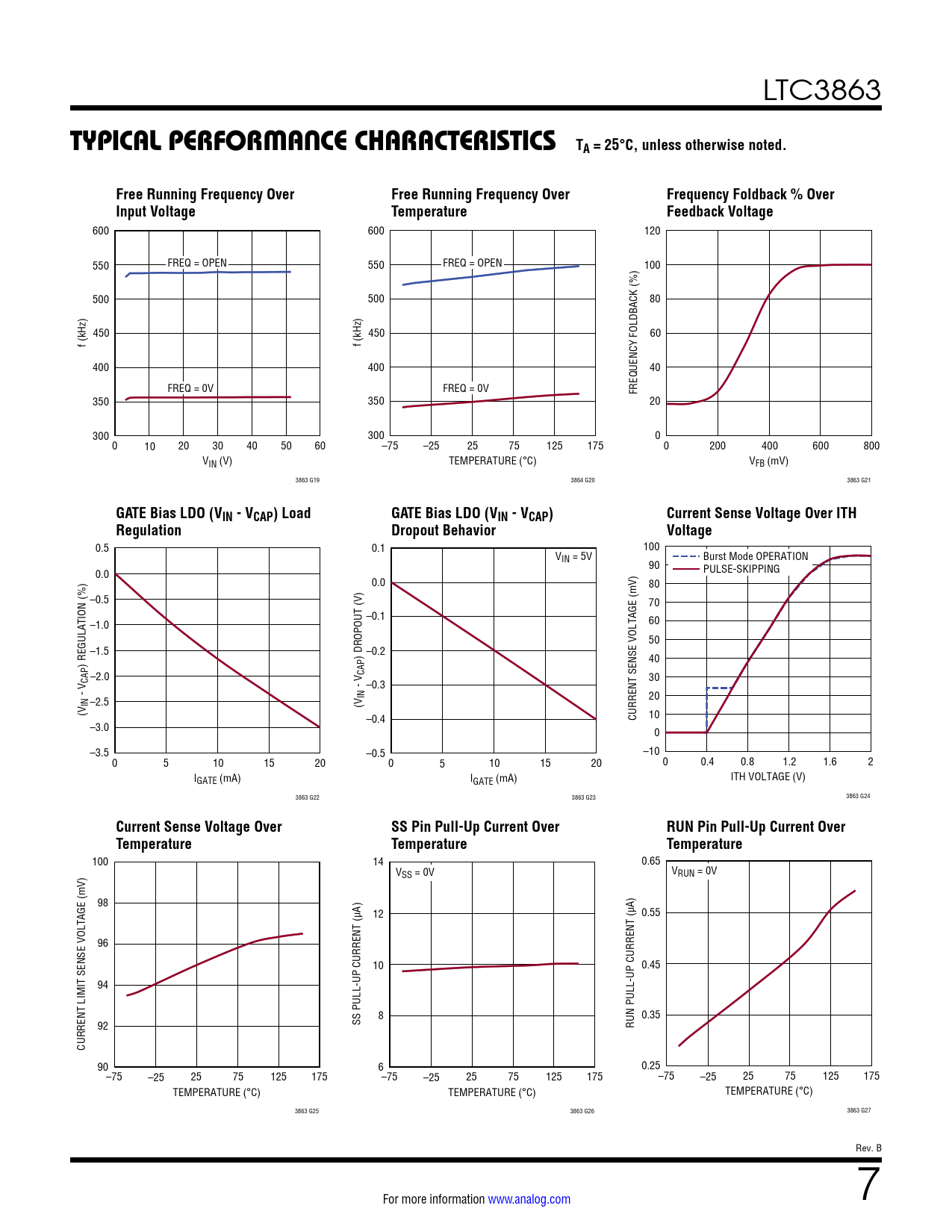 600 600 120 550 FREQ = OPEN 550 FREQ = OPEN 100 500 500 80 450 450 60 f (kHz) f (kHz) 400 400 40 FREQ = 0V FREQ = 0V FREQUENCY FOLDBACK (%) 350 350 20 300 300 0 0 10 20 30 40 50 60 –75 –25 25 75 125 175 0 200 400 600 800 VIN (V) TEMPERATURE (°C) VFB (mV) 3863 G19 3864 G20 3863 G21