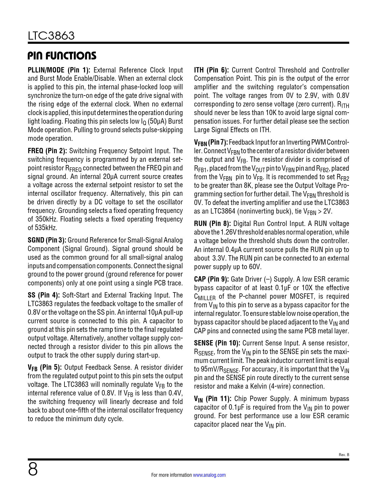 Páginas / Página38 / 8 — PIN FUNCTIONS. PLLIN/MODE (Pin 1):. ITH (Pin 6):. VFBN (Pin 7):. FREQ …