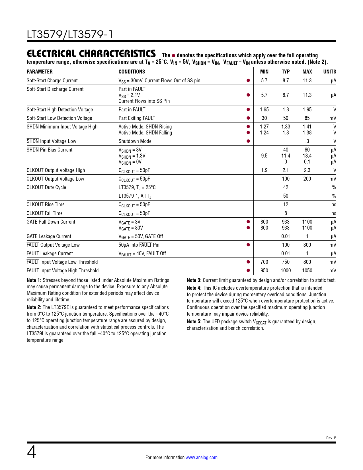 Soft-Start Charge Current VSS = 30mV, Current Flows Out of SS pin l 5.7 8.7 11.3 µA Soft-Start Discharge Current Part in FAULT VSS = 2.1V, l 5.7 8.7 11.3 µA Current Flows into SS Pin Soft-Start High Detection Voltage Part in FAULT l 1.65 1.8 1.95 V Soft-Start Low Detection Voltage Part Exiting FAULT l 30 50 85 mV SHDN Minimum Input Voltage High Active Mode, SHDN Rising l 1.27 1.33 1.41 V Active Mode, SHDN Falling l 1.24 1.3 1.38 V SHDN Input Voltage Low Shutdown Mode l .3 V SHDN Pin Bias Current VSHDN = 3V 40 60 µA VSHDN = 1.3V 9.5 11.4 13.4 µA VSHDN = 0V 0 0.1 µA CLKOUT Output Voltage High CCLKOUT = 50pF 1.9 2.1 2.3 V CLKOUT Output Voltage Low CCLKOUT = 50pF 100 200 mV CLKOUT Duty Cycle LT3579, TJ = 25°C 42 % LT3579-1, All TJ 50 % CLKOUT Rise Time CCLKOUT = 50pF 12 ns CLKOUT Fall Time CCLKOUT = 50pF 8 ns GATE Pull Down Current VGATE = 3V l 800 933 1100 µA VGATE = 80V l 800 933 1100 µA GATE Leakage Current VGATE = 50V, GATE Off 0.01 1 µA FAULT Output Voltage Low 50μA into FAULT Pin l 100 300 mV FAULT Leakage Current VFAULT = 40V, FAULT Off 0.01 1 µA FAULT Input Voltage Low Threshold l 700 750 800 mV FAULT Input Voltage High Threshold l 950 1000 1050 mV