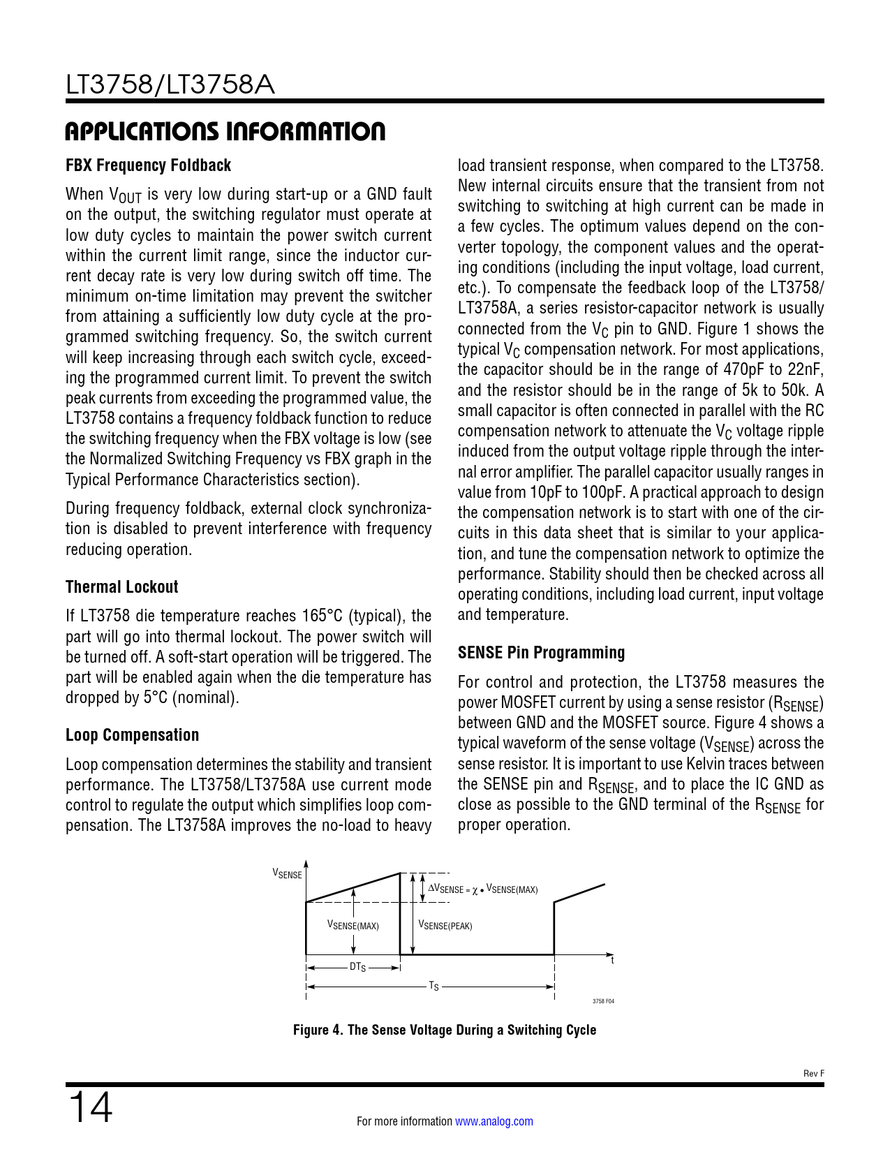 link to page 5 link to page 9 link to page 14 LT3758/LT3758A APPLICATIONS INFORMATIONFBX Frequency Foldback load transient response, when compared to the LT3758. When V New internal circuits ensure that the transient from not OUT is very low during start-up or a GND fault on the output, the switching regulator must operate at switching to switching at high current can be made in low duty cycles to maintain the power switch current a few cycles. The optimum values depend on the con- within the current limit range, since the inductor cur- verter topology, the component values and the operat- rent decay rate is very low during switch off time. The ing conditions (including the input voltage, load current, minimum on-time limitation may prevent the switcher etc.). To compensate the feedback loop of the LT3758/ from attaining a sufficiently low duty cycle at the pro- LT3758A, a series resistor-capacitor network is usually grammed switching frequency. So, the switch current connected from the VC pin to GND. Figure 1 shows the will keep increasing through each switch cycle, exceed- typical VC compensation network. For most applications, ing the programmed current limit. To prevent the switch the capacitor should be in the range of 470pF to 22nF, peak currents from exceeding the programmed value, the and the resistor should be in the range of 5k to 50k. A LT3758 contains a frequency foldback function to reduce small capacitor is often connected in parallel with the RC the switching frequency when the FBX voltage is low (see compensation network to attenuate the VC voltage ripple the Normalized Switching Frequency vs FBX graph in the induced from the output voltage ripple through the inter- Typical Performance Characteristics section). nal error amplifier. The parallel capacitor usually ranges in value from 10pF to 100pF. A practical approach to design During frequency foldback, external clock synchroniza- the compensation network is to start with one of the cir- tion is disabled to prevent interference with frequency cuits in this data sheet that is similar to your applica- reducing operation. tion, and tune the compensation network to optimize the performance. Stability should then be checked across all Thermal Lockout operating conditions, including load current, input voltage If LT3758 die temperature reaches 165°C (typical), the and temperature. part will go into thermal lockout. The power switch will be turned off. A soft-start operation will be triggered. The SENSE Pin Programming part will be enabled again when the die temperature has For control and protection, the LT3758 measures the dropped by 5°C (nominal). power MOSFET current by using a sense resistor (RSENSE) between GND and the MOSFET source. Figure 4 shows a Loop Compensation typical waveform of the sense voltage (VSENSE) across the Loop compensation determines the stability and transient sense resistor. It is important to use Kelvin traces between performance. The LT3758/LT3758A use current mode the SENSE pin and RSENSE, and to place the IC GND as control to regulate the output which simplifies loop com- close as possible to the GND terminal of the RSENSE for pensation. The LT3758A improves the no-load to heavy proper operation. VSENSE ∆VSENSE = χ • VSENSE(MAX) VSENSE(MAX) VSENSE(PEAK) t DTS TS 3758 F04 Figure 4. The Sense Voltage During a Switching Cycle Rev F 14 For more information www.analog.com Document Outline Features Applications Description Typical Application Absolute Maximum Ratings Pin Configuration Order Information Electrical Characteristics Typical Performance Characteristics Pin Functions Block Diagram Applications Information Typical Applications Package Description Revision History Typical Applications Related Parts Typical Applications Features Applications Typical Application Description Absolute Maximum Ratings Pin Configuration Order Information Electrical Characteristics Typical Performance Characteristics Pin Functions Block Diagram Applications Information Typical Applications Package Description Revision History Typical Application Related Parts