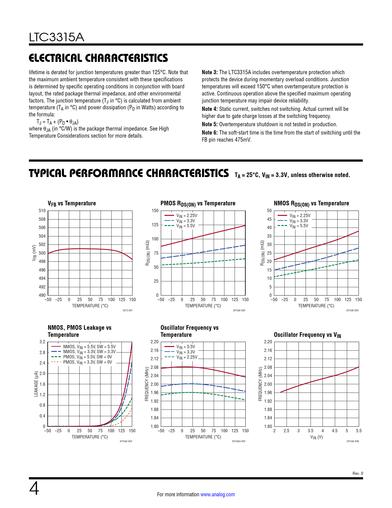 LTC3315A ELECTRICAL CHARACTERISTICS lifetime is derated for junction temperatures greater than 125°C. Note that Note 3: The LTC3315A includes overtemperature protection which the maximum ambient temperature consistent with these specifications protects the device during momentary overload conditions. Junction is determined by specific operating conditions in conjunction with board temperatures will exceed 150°C when overtemperature protection is layout, the rated package thermal impedance, and other environmental active. Continuous operation above the specified maximum operating factors. The junction temperature (TJ in °C) is calculated from ambient junction temperature may impair device reliability. temperature (TA in °C) and power dissipation (PD in Watts) according to Note 4: Static current, switches not switching. Actual current will be the formula: higher due to gate charge losses at the switching frequency. TJ = TA + (PD • θJA) Note 5: Overtemperature shutdown is not tested in production. where θJA (in °C/W) is the package thermal impedance. See High Temperature Considerations section for more details. Note 6: The soft-start time is the time from the start of switching until the FB pin reaches 475mV. TYPICAL PERFORMANCE CHARACTERISTICS TA = 25°C, VIN = 3.3V, unless otherwise noted.VFB vs TemperaturePMOS RDS(ON) vs TemperatureNMOS RDS(ON) vs Temperature 510 150 50 V V 508 IN = 2.25V IN = 2.25V V 45 IN = 3.3V VIN = 3.3V 125 506 VIN = 5.5V V 40 IN = 5.5V 504 35 100 502 30 (mΩ) (mΩ) (mV) 500 75 25 V FB 498 R DS(ON) 20 R DS(ON) 50 496 15 494 10 25 492 5 490 0 0 –50 –25 0 25 50 75 100 125 150 –50 –25 0 25 50 75 100 125 150 –50 –25 0 25 50 75 100 125 150 TEMPERATURE (°C) TEMPERATURE (°C) TEMPERATURE (°C) 3315 G01 3315ab G02 3315ab G03 NMOS, PMOS Leakage vsOscillator Frequency vsTemperatureTemperatureOscillator Frequency vs VIN 3.2 2.20 2.20 NMOS, VIN = 5.5V, SW = 5.5V VIN = 5.5V 2.8 NMOS, V 2.16 2.16 IN = 3.3V, SW = 3.3V VIN = 3.3V PMOS, VIN = 5.5V, SW = 0V V 2.12 IN = 2.25V 2.12 2.4 PMOS, VIN = 3.3V, SW = 0V 2.08 2.08 2.0 2.04 2.04 1.6 2.00 2.00 1.96 1.96 LEAKAGE (µA) 1.2 FREQUENCY (MHz) 1.92 FREQUENCY (MHz) 1.92 0.8 1.88 1.88 0.4 1.84 1.84 0 1.80 1.80 –50 –25 0 25 50 75 100 125 150 –50 –25 0 25 50 75 100 125 150 2 2.5 3 3.5 4 4.5 5 5.5 TEMPERATURE (°C) TEMPERATURE (°C) VIN (V) 3315ab G04 3315aba G05 3315ab G06 Rev. 0 4 For more information www.analog.com Document Outline Features Applications Typical Application Description Absolute Maximum Ratings Order Information Electrical Characteristics Pin Configuration Typical Performance Characteristics Pin Functions Block Diagram Operation Applications Information Typical Applications Package Description Typical Application Related Parts