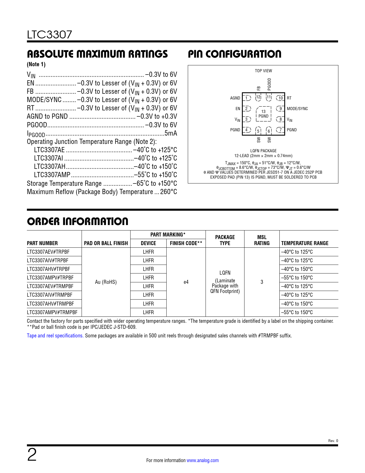 LTC3307 ABSOLUTE MAXIMUM RATINGSPIN CONFIGURATION(Note 1) V TOP VIEW IN .. –0.3V to 6V EN .. –0.3V to Lesser of (VIN + 0.3V) or 6V FB .. –0.3V to Lesser of (V FB PGOOD IN + 0.3V) or 6V MODE/SYNC .. –0.3V to Lesser of (V 12 11 IN + 0.3V) or 6V AGND 1 10 RT RT .. –0.3V to Lesser of (VIN + 0.3V) or 6V EN 2 9 MODE/SYNC 13 AGND to PGND ... –0.3V to +0.3V PGND V 3 8 V PGOOD ... –0.3V to 6V IN IN I PGND 4 7 PGND 5 6 PGOOD ..5mA Operating Junction Temperature Range (Note 2): SW SW LTC3307AE ... –40˚C to +125°C LQFN PACKAGE LTC3307AI ...–40˚C to +125˚C 12-LEAD (2mm × 2mm × 0.74mm) LTC3307AH ..–40˚C to +150˚C TJMAX = 150°C, θJA = 51°C/W, θJB = 12°C/W, θJCBOTTOM = 8.6°C/W, θJCTOP = 73°C/W, ΨJT = 0.6°C/W LTC3307AMP ...–55˚C to +150˚C θ AND Ψ VALUES DETERMINED PER JESD51-7 ON A JEDEC 2S2P PCB, EXPOSED PAD (PIN 13) IS PGND, MUST BE SOLDERED TO PCB Storage Temperature Range ...–65˚C to +150°C Maximum Reflow (Package Body) Temperature ...260°C ORDER INFORMATIONPART MARKING*PACKAGEMSLPART NUMBERPAD OR BALL FINISHDEVICEFINISH CODE**TYPERATINGTEMPERATURE RANGE LTC3307AEV#TRPBF LHFR –40°C to 125°C LTC3307AIV#TRPBF LHFR –40°C to 125°C LTC3307AHV#TRPBF LHFR –40°C to 150°C LQFN LTC3307AMPV#TRPBF LHFR –55°C to 150°C Au (RoHS) e4 (Laminate 3 LTC3307AEV#TRMPBF LHFR Package with –40°C to 125°C QFN Footprint) LTC3307AIV#TRMPBF LHFR –40°C to 125°C LTC3307AHV#TRMPBF LHFR –40°C to 150°C LTC3307AMPV#TRMPBF LHFR –55°C to 150°C Contact the factory for parts specified with wider operating temperature ranges. *The temperature grade is identified by a label on the shipping container. **Pad or ball finish code is per IPC/JEDEC J-STD-609. Tape and reel specifications. Some packages are available in 500 unit reels through designated sales channels with #TRMPBF suffix. Rev. 0 2 For more information www.analog.com Document Outline Features Applications Typical Application Description Absolute Maximum Ratings Order Information Pin Configuration Electrical Characteristics Typical Performance Characteristics Pin Functions Block Diagram Operation Applications Information Typical Applications Package Description Typical Application Related Parts