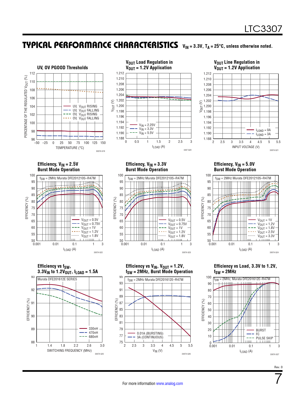 112 1.212 1.212 1.210 1.210 (%) 110 1.208 OUT 1.208 108 1.206 1.206 TED V 1.204 1.204 106 1.202 1.202 (V) (V) 104 UV, V 1.200 OUT RISING 1.200 UV, VOUT FALLING V OUT 1.198 V OUT 1.198 102 OV, VOUT RISING 1.196 1.196 OV, VOUT FALLING 1.194 AGE OF THE REGULA 100 1.194 VIN = 2.25V 1.192 1.192 VIN = 3.3V I 98 LOAD = 0A 1.190 VIN = 5.5V 1.190 ILOAD = 3A PERCENT 1.188 96 1.188 0 0.5 1 1.5 2 2.5 3 2 2.5 3 3.5 4 4.5 5 5.5 –50 –25 0 25 50 75 100 125 150 I TEMPERATURE (°C) LOAD (A) INPUT VOLTAGE (V) 3307 G20 3307A G21 3307A G19