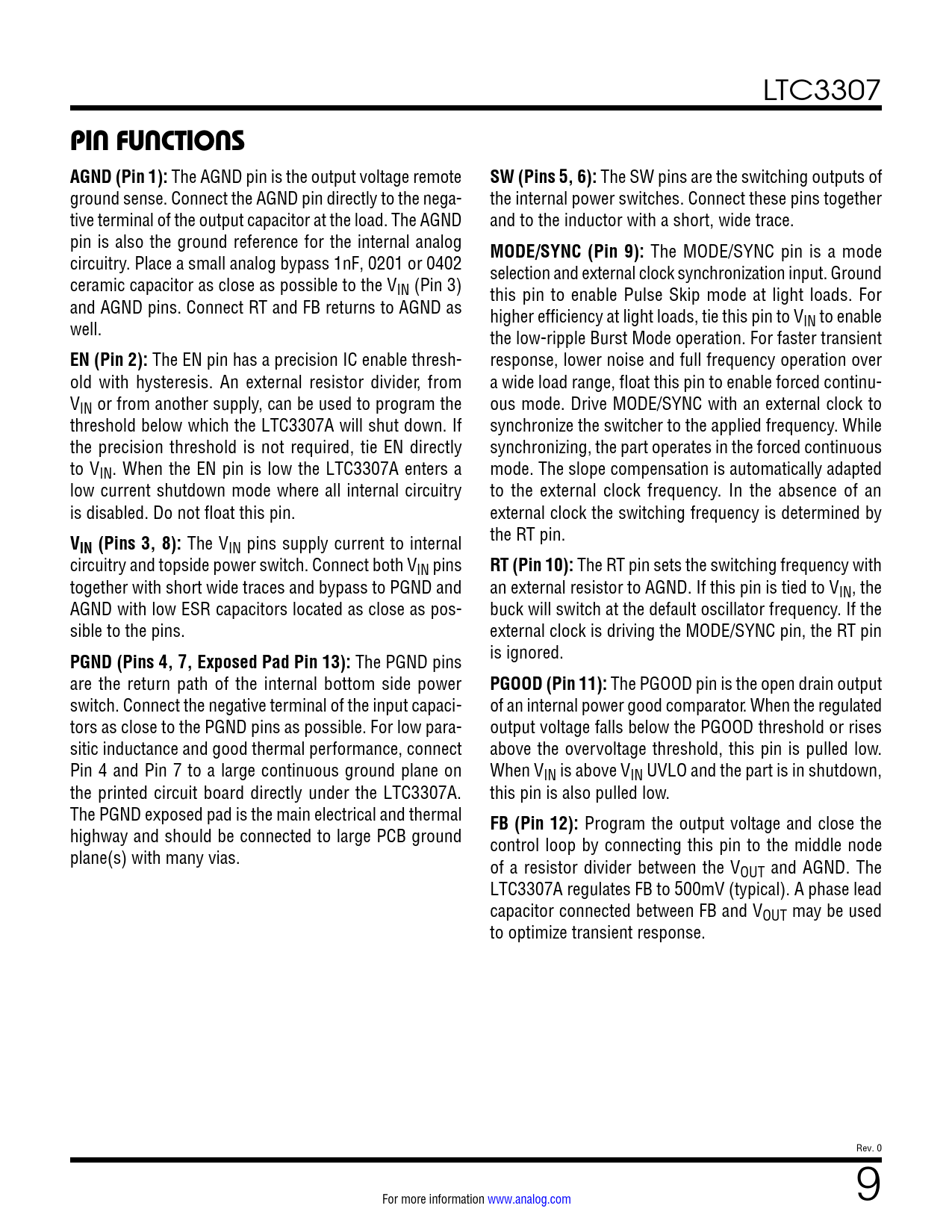 Páginas / Página24 / 9 — PIN FUNCTIONS AGND (Pin 1):. SW (Pins 5, 6):. MODE/SYNC (Pin 9):. EN (Pin …