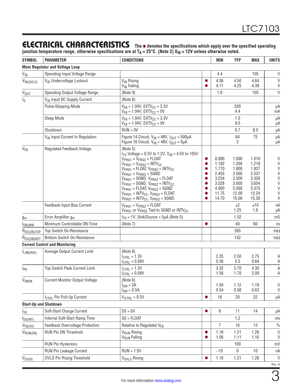 VIN Operating Input Voltage Range 4.4 105 V VIN(UVLO) VIN Undervoltage Lockout VIN Rising l 4.36 4.50 4.64 V VIN Falling l 4.11 4.25 4.39 V VOUT Operating Output Voltage Range (Note 9) 1.0 105 V IQ VIN Input DC Supply Current (Note 8) Pulse-Skipping Mode VFB = 1.04V, EXTVCC = 3.3V 200 µA VFB = 1.04V, EXTVCC = 0V 4.4 mA Sleep Mode VFB = 1.04V, EXTVCC = 3.3V 1.0 µA VFB = 1.04V, EXTVCC = 0V 9.0 µA Shutdown RUN = 0V 0.7 8.0 µA VIN Input Current In Regulation Figure 14 Circuit, VIN = 48V, IOUT = 500μA 64 75 µA Figure 16 Circuit, VIN = 48V, IOUT = 0μA 2 µA VFB Regulated Feedback Voltage (Note 5) ITH Voltage = 0.5V to 1.2V, VIN = 4.5V to 105V VPRG1 = VPRG2 = FLOAT l 0.990 1.000 1.010 V VPRG1 = VPRG2 = INTVCC l 1.182 1.200 1.218 V VPRG1 = FLOAT, VPRG2 = INTVCC l 1.770 1.800 1.827 V VPRG1 = VPRG2 = SGND l 2.455 2.500 2.537 V VPRG1 = SGND, VPRG2 = FLOAT l 3.234 3.300 3.350 V VPRG1 = SGND, VPRG2 = INTVCC l 3.528 3.600 3.654 V VPRG1 = FLOAT, VPRG2 = SGND l 4.900 5.000 5.075 V VPRG1 = INTVCC, VPRG2 = FLOAT l 11.75 12.00 12.24 V VPRG1 = INTVCC, VPRG2 = SGND l 14.70 15.00 15.30 V Feedback Input Bias Current VPRG1 = VPRG2 = FLOAT ±2 ±10 nA VPRG1 or VPRG2 Tied to SGND or INTVCC 1.25 1.6 µA gm Error Amplifier gm ITH = 1V, Sink/Source = 5µA (Note 5) 1.52 mS tON,MIN Minimum Controllable ON-Time (Note 7) l 40 60 ns RDS(ON)TOP Top Switch On-Resistance 265 mΩ RDS(ON)BOT Bottom Switch On-Resistance 142 mΩ