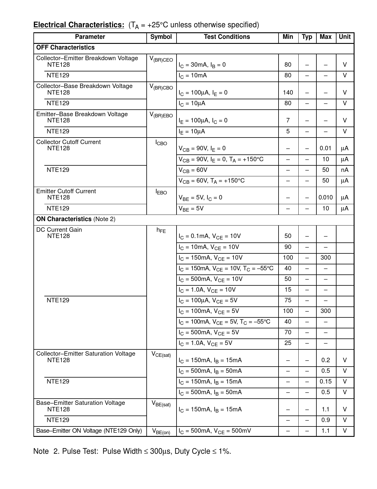 Collector–Emitter Breakdown Voltage V(BR)CEO NTE128 IC = 30mA, IB = 0 80 – – V NTE129 IC = 10mA 80 – – V Collector–Base Breakdown Voltage V(BR)CBO NTE128 IC = 100µA, IE = 0 140 – – V NTE129 IC = 10µA 80 – – V Emitter–Base Breakdown Voltage V(BR)EBO NTE128 IE = 100µA, IC = 0 7 – – V NTE129 IE = 10µA 5 – – V Collector Cutoff Current ICBO NTE128 VCB = 90V, IE = 0 – – 0.01 µA VCB = 90V, IE = 0, TA = +150°C – – 10 µA NTE129 VCB = 60V – – 50 nA VCB = 60V, TA = +150°C – – 50 µA Emitter Cutoff Current IEBO NTE128 VBE = 5V, IC = 0 – – 0.010 µA NTE129 VBE = 5V – – 10 µA