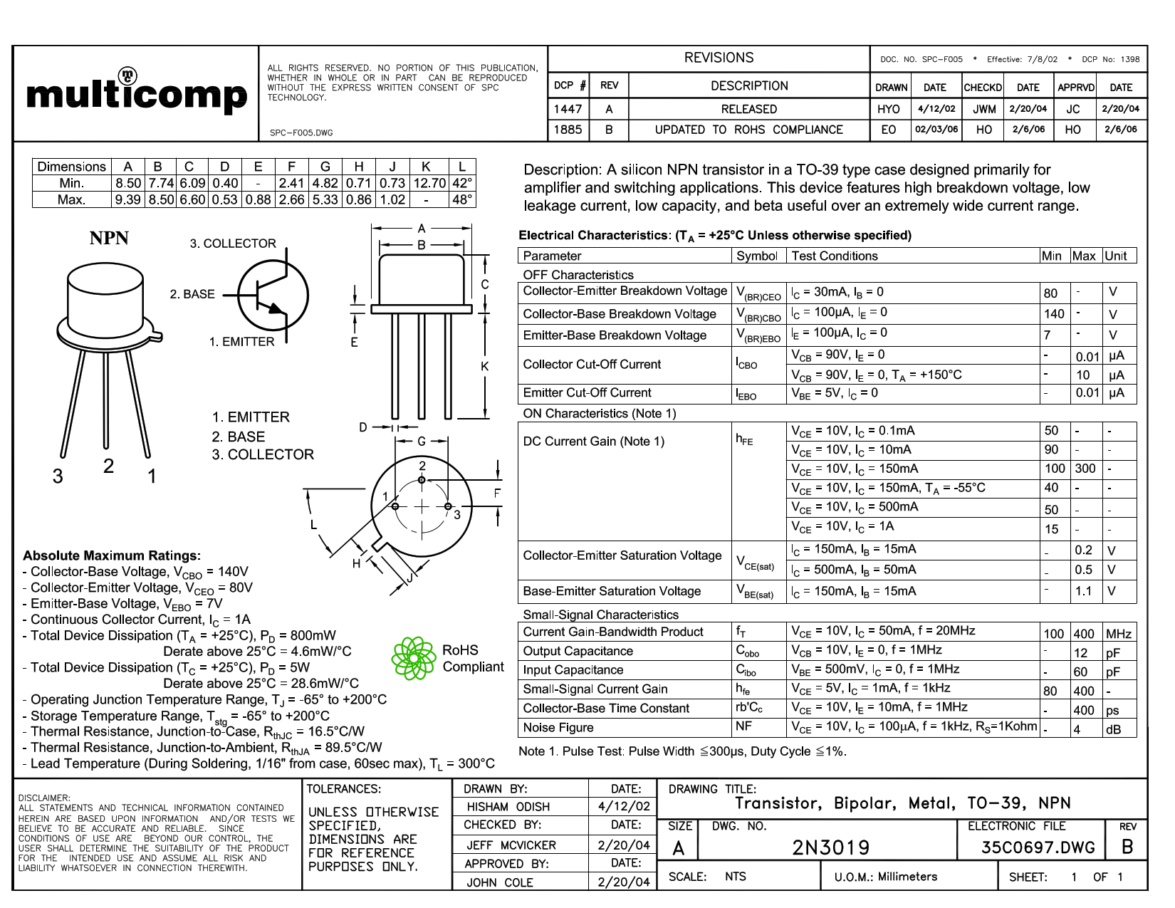 Bipolar (BJT) Single Transistor, NPN, 80 V, 400 MHz, 800 mW, 1 A, 50 hFE